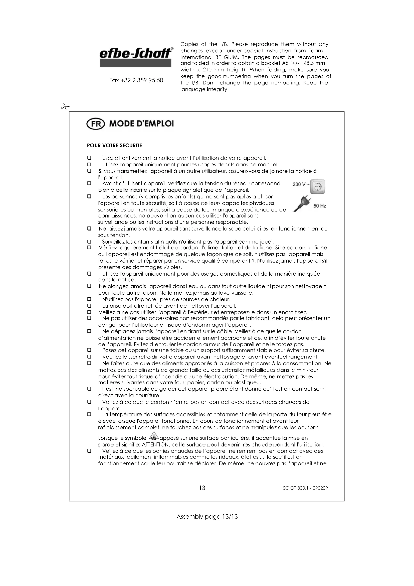 Fax +32 2 359 95 50 posez rien dessus. Prenez également garde que rien ne doit rentrer en contact avec l’élément chauffant de l’appareil. Il est conseillé de placer un revêtement thermifuge entre l’appareil et le support dans le but également de ne pas laisser des marques, provoquées par la chaleur, sur le revêtement de votre support. Les préparations à l'huile ou à la graisse peuvent s'enflammer si elles sont surchauffées. Soyez donc extrêmement prudent. Lors de la cuisson ou le réchauffage de tranches de pain, n’excédez en aucun cas une durée de 10 minutes. Il pourrait en résulter une combustion du pain. Cette remarque est d'autant plus importante que la minuterie permet une durée de 60 minutes; cette durée maximum est destinée à d'autres usages que le réchauffage du pain.