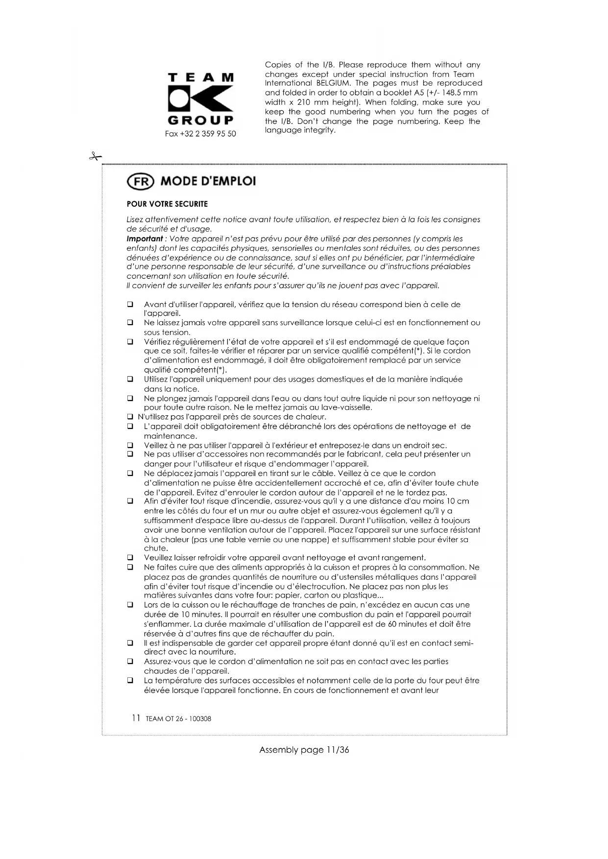 Lisez attentivement cette notice avant toute utilisation, et respectez bien à la fois les consignes de sécurité et d'usage. Important : Votre appareil n’est pas prévu pour être utilisé par des personnes (y compris les enfants) dont les capacités physiques, sensorielles ou mentales sont réduites, ou des personnes dénuées d’expérience ou de connaissance, sauf si elles ont pu bénéficier, par l’intermédiaire d’une personne responsable de leur sécurité, d’une surveillance ou d’instructions préalables concernant son utilisation en toute sécurité. Il convient de surveiller les enfants pour s’assurer qu’ils ne jouent pas avec l’appareil. Avant d'utiliser l'appareil, vérifiez que la tension du réseau correspond bien à celle de l'appareil. Ne laissez jamais votre appareil sans surveillance lorsque celui-ci est en fonctionnement ou sous tension. Vérifiez régulièrement l’état de votre appareil et s’il est endommagé de quelque façon que ce soit, faites-le vérifier et réparer par un service qualifié compétent(*). Si le cordon d’alimentation est endommagé, il doit être obligatoirement remplacé par un service qualifié compétent(*). Utilisez l'appareil uniquement pour des usages domestiques et de la manière indiquée dans la notice. Ne plongez jamais l'appareil dans l'eau ou dans tout autre liquide ni pour son nettoyage ni pour toute autre raison. Ne le mettez jamais au lave-vaisselle. N'utilisez pas l'appareil près de sources de chaleur. L’appareil doit obligatoirement être débranché lors des opérations de nettoyage et de maintenance. Veillez à ne pas utiliser l'appareil à l'extérieur et entreposez-le dans un endroit sec. Ne pas utiliser d’accessoires non recommandés par le fabricant, cela peut présenter un danger pour l’utilisateur et risque d’endommager l’appareil. Ne déplacez jamais l’appareil en tirant sur le câble. Veillez à ce que le cordon d’alimentation ne puisse être accidentellement accroché et ce, afin d’éviter toute chute de l’appareil. Evitez d’enrouler le cordon autour de l’appareil et ne le tordez pas. Afin d'éviter tout risque d'incendie, assurez-vous qu'il y a une distance d'au moins 10 cm entre les côtés du four et un mur ou autre objet et assurez-vous également qu'il y a suffisamment d'espace libre au-dessus de l'appareil. Durant l’utilisation, veillez à toujours avoir une bonne ventilation autour de l’appareil. Placez l'appareil sur une surface résistant à la chaleur (pas une table vernie ou une nappe) et suffisamment stable pour éviter sa chute. Veuillez laisser refroidir votre appareil avant nettoyage et avant rangement. Ne faites cuire que des aliments appropriés à la cuisson et propres à la consommation. Ne placez pas de grandes quantités de nourriture ou d’ustensiles métalliques dans l’appareil afin d’éviter tout risque d’incendie ou d’électrocution. Ne placez pas non plus les matières suivantes dans votre four: papier, carton ou plastique... Lors de la cuisson ou le réchauffage de tranches de pain, n’excédez en aucun cas une durée de 10 minutes. Il pourrait en résulter une combustion du pain et l'appareil pourrait s'enflammer. La durée maximale d’utilisation de l’appareil est de 60 minutes et doit être réservée à d’autres fins que de réchauffer du pain. Il est indispensable de garder cet appareil propre étant donné qu’il est en contact semi- direct avec la nourriture. Assurez-vous que le cordon d’alimentation ne soit pas en contact avec les parties chaudes de l’appareil. La température des surfaces accessibles et notamment celle de la porte du four peut être élevée lorsque l'appareil fonctionne. En cours de fonctionnement et avant leur Copies of the I/B. Please reproduce them without any changes except under special instruction from Team International BELGIUM. The pages must be reproduced and folded in order to obtain a booklet A5 (+/- 148.5 mm width x 210 mm height). When folding, make sure you keep the good numbering when you turn the pages of the I/B. Don’t change the page numbering. Keep the language integrity.
