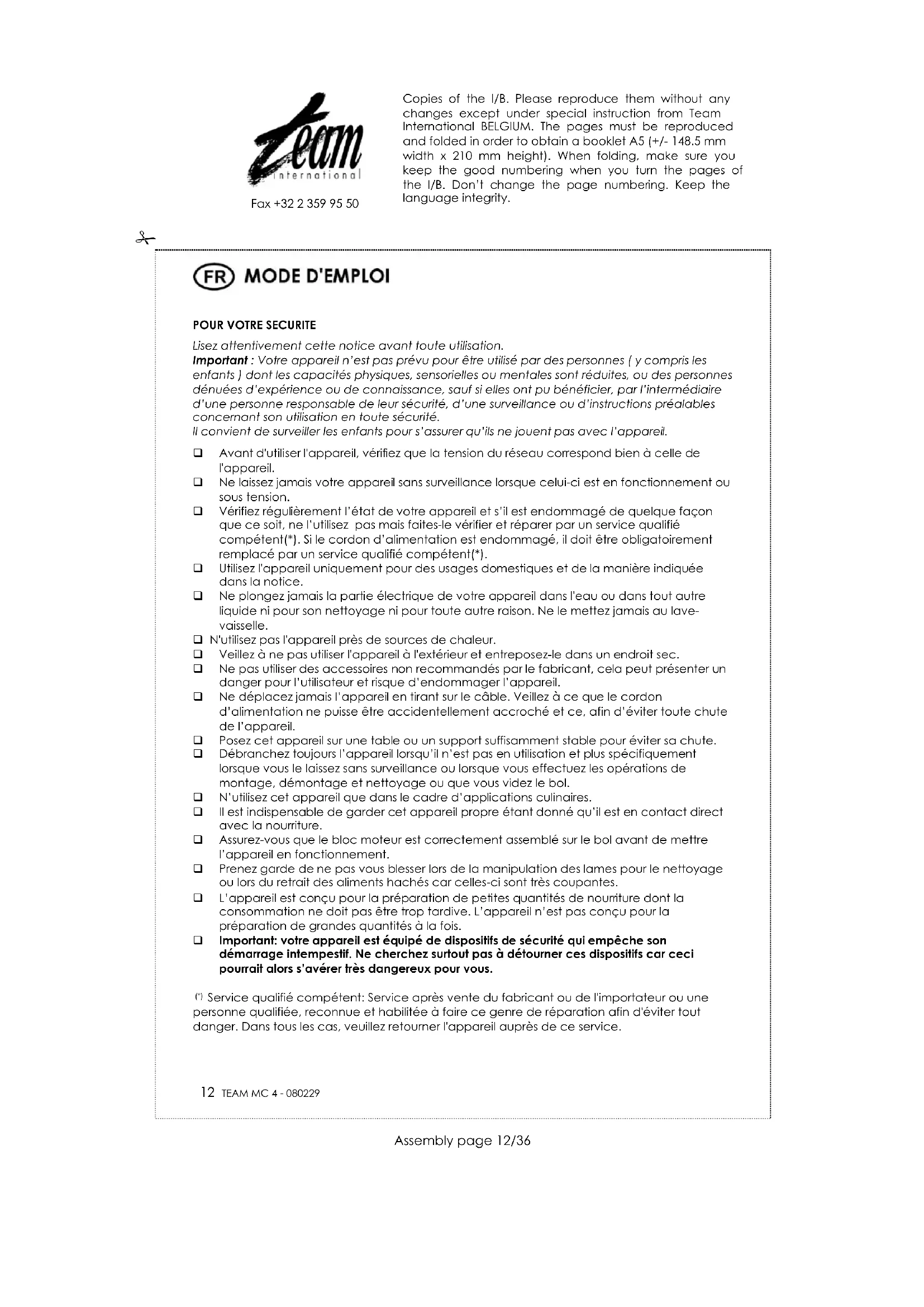 Service qualifié compétent: Service après vente du fabricant ou de l'importateur ou une personne qualifiée, reconnue et habilitée à faire ce genre de réparation afin d'éviter tout danger. Dans tous les cas, veuillez retourner l'appareil auprès de ce service. Copies of the I/B. Please reproduce them without any changes except under special instruction from Team International BELGIUM. The pages must be reproduced and folded in order to obtain a booklet A5 (+/- 148.5 mm width x 210 mm height). When folding, make sure you keep the good numbering when you turn the pages of the I/B. Don’t change the page numbering. Keep the language integrity.