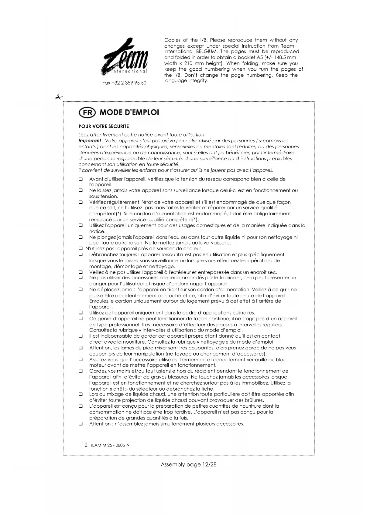 Afin de préserver notre environnement et notre santé, l’élimination en fin de vie des appareils électriques et électroniques doit se faire selon des règles bien précises et nécessite l’implication de chacun, qu’il soit fournisseur ou utilisateur. C’est pour cette raison que votre appareil, tel que le signale le symbole apposé sur sa plaque signalétique ou sur l'emballage, ne doit en aucun cas être jeté dans une poubelle publique ou privée destinée aux ordures ménagères. L'utilisateur a le droit de déposer l'appareil dans des lieux publics de collecte procédant à un tri sélectif des déchets pour être soit recyclé, soit réutilisé pour d’autres applications conformément à la directive. Copies of the I/B. Please reproduce them without any changes except under special instruction from Team International BELGIUM. The pages must be reproduced and folded in order to obtain a booklet A5 (+/- 148.5 mm width x 210 mm height). When folding, make sure you keep the good numbering when you turn the pages of the I/B. Don’t change the page numbering. Keep the language integrity.