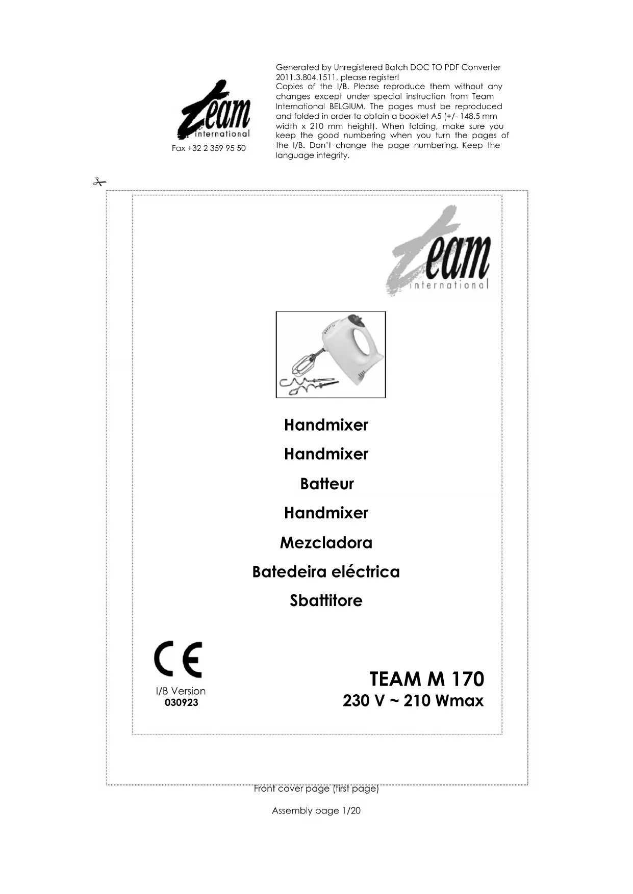 Le sélecteur de vitesse doit être en position « arrêt » et la fiche du cordon d’alimentation obligatoirement débranchée avant de nettoyer l'appareil, de changer les accessoires ou lorsqu’il n’est pas en utilisation. Ne laissez jamais votre appareil sans surveillance lorsque celui-ci est sous tension. Veillez à ne pas utiliser l'appareil à l'extérieur et entreposez-le dans un endroit sec. Ne pas utiliser des accessoires non recommandés par le fabricant, cela peut présenter un danger pour l’utilisateur et risque d’endommager l’appareil. Ne déplacez jamais l’appareil en tirant sur le câble. Veillez à ce que le cordon d’alimentation ne puisse être accidentellement accroché et ce, afin d’éviter toute chute de l’appareil. Évitez d’enrouler le cordon autour de l’appareil et ne le tordez pas. Débranchez l’appareil lorsqu’il n’est pas en utilisation. N’utilisez ce mixeur que dans le cadre d’applications culinaires. Ce genre d’appareil ne peut fonctionner de façon continue, il ne s’agit pas d’un appareil de type professionnel. Il est nécessaire d’effectuer des pauses à intervalles réguliers. Consultez la rubrique « Intervalles d’utilisation » du mode d’emploi. Il est indispensable de garder cet appareil propre étant donné qu’il est en contact direct avec la nourriture. Il est indispensable de débrancher l’appareil avant de monter, démonter ou nettoyer un des accessoires. Remarquez qu’il faut impérativement démonter les accessoires avant de les nettoyer. Si votre kit comprend un pied plongeant, veillez donc à ne pas vous couper, manipulez-le prudemment car la lame de cet accessoire est extrêmement coupante. Assurez-vous que l’accessoire utilisé soit fermement et correctement verrouillé au bloc moteur avant de mettre l’appareil en marche. Gardez vos mains et/ou tout ustensile hors du récipient pendant le fonctionnement de l’appareil afin d’éviter de graves blessures Un grattoir (pour aider à nettoyer les accessoires) ne peut-être utilisé que lorsque l’appareil est débranché. Lors du mixage de liquide chaud, une attention toute particulière doit être apportée afin d’éviter toute projection de liquide chaud pouvant provoquer des brûlures. L’appareil est conçu pour la préparation de petites quantités de nourriture dont la consommation ne doit pas être trop tardive. L’appareil n’est pas conçu pour la préparation de grandes quantités à la fois. Copies of the I/B. Please reproduce them without any changes except under special instruction from Team International BELGIUM. The pages must be reproduced and folded in order to obtain a booklet A5 (+/- 148.5 mm width x 210 mm height). When folding, make sure you keep the good numbering when you turn the pages of the I/B. Don’t change the page numbering. Keep the language integrity.
