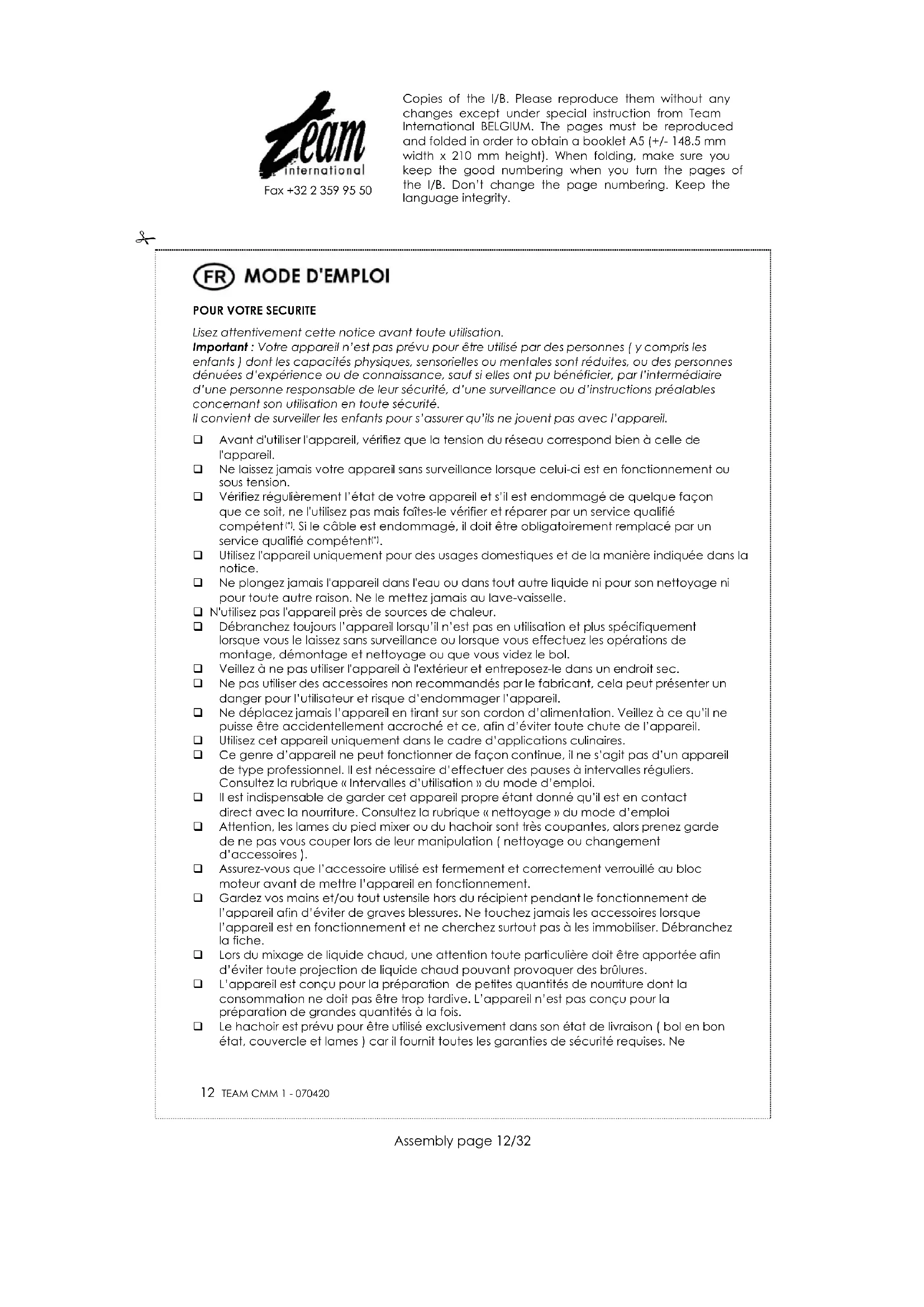 Utilisez l'appareil uniquement pour des usages domestiques et de la manière indiquée dans la notice. Ne plongez jamais l'appareil dans l'eau ou dans tout autre liquide ni pour son nettoyage ni pour toute autre raison. Ne le mettez jamais au lave-vaisselle. N'utilisez pas l'appareil près de sources de chaleur. Débranchez toujours l’appareil lorsqu’il n’est pas en utilisation et plus spécifiquement lorsque vous le laissez sans surveillance ou lorsque vous effectuez les opérations de montage, démontage et nettoyage ou que vous videz le bol. Veillez à ne pas utiliser l'appareil à l'extérieur et entreposez-le dans un endroit sec. Ne pas utiliser des accessoires non recommandés par le fabricant, cela peut présenter un danger pour l’utilisateur et risque d’endommager l’appareil. Ne déplacez jamais l’appareil en tirant sur son cordon d’alimentation. Veillez à ce qu’il ne puisse être accidentellement accroché et ce, afin d’éviter toute chute de l’appareil. Utilisez cet appareil uniquement dans le cadre d’applications culinaires. Ce genre d’appareil ne peut fonctionner de façon continue, il ne s’agit pas d’un appareil de type professionnel. Il est nécessaire d’effectuer des pauses à intervalles réguliers. Consultez la rubrique « Intervalles d’utilisation » du mode d’emploi. Il est indispensable de garder cet appareil propre étant donné qu’il est en contact direct avec la nourriture. Consultez la rubrique « nettoyage » du mode d’emploi Attention, les lames du pied mixer ou du hachoir sont très coupantes, alors prenez garde de ne pas vous couper lors de leur manipulation ( nettoyage ou changement d’accessoires ). Assurez-vous que l’accessoire utilisé est fermement et correctement verrouillé au bloc moteur avant de mettre l’appareil en fonctionnement. Gardez vos mains et/ou tout ustensile hors du récipient pendant le fonctionnement de l’appareil afin d’éviter de graves blessures. Ne touchez jamais les accessoires lorsque l’appareil est en fonctionnement et ne cherchez surtout pas à les immobiliser. Débranchez la fiche. Lors du mixage de liquide chaud, une attention toute particulière doit être apportée afin d’éviter toute projection de liquide chaud pouvant provoquer des brûlures. L’appareil est conçu pour la préparation de petites quantités de nourriture dont la consommation ne doit pas être trop tardive. L’appareil n’est pas conçu pour la préparation de grandes quantités à la fois. Le hachoir est prévu pour être utilisé exclusivement dans son état de livraison ( bol en bon état, couvercle et lames ) car il fournit toutes les garanties de sécurité requises. Ne Copies of the I/B. Please reproduce them without any changes except under special instruction from Team International BELGIUM. The pages must be reproduced and folded in order to obtain a booklet A5 (+/- 148.5 mm width x 210 mm height). When folding, make sure you keep the good numbering when you turn the pages of the I/B. Don’t change the page numbering. Keep the language integrity.