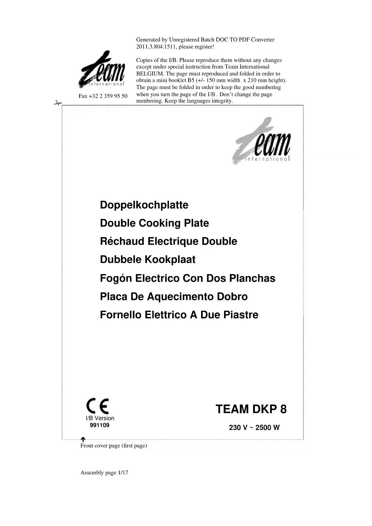 UTILISATION Assurez-vous que le voltage de l'appareil correspond à celui de votre installation électrique. Posez l'appareil sur une surface plane, sèche et résistante à la chaleur, près d'une prise de courant. Les commutateurs doivent se trouver en position "Eteint" (0 vers le haut). Branchez l'appareil. Avant la première utilisation, faites chauffer l‟appareil pendant 10 minutes afin de fixer le vernis de protection de la (des) plaque(s) et lui donner une résistance maximum. Eteignez et laissez refroidir. Votre appareil peut à présent être utilisé. Utilisez uniquement des casseroles ou poêles avec un double fond conçues pour les plaques électriques. Leur diamètre ne devra pas être inférieur à celui de la (des) plaque(s) afin d'éviter toute perte de chaleur inutile. Pour faire chauffer la (les) plaque(s), tournez le bouton du commutateur vers la droite pour l‟amener dans la position souhaitée. La (les) plaques(s) continue(nt) à chauffer une fois éteinte(s). Vous pouvez profiter de cette chaleur résiduelle pour réchauffer des aliments. ENTRETIEN Veuillez retirer la fiche de la prise de courant et attendre que l‟appareil refroidisse avant de le nettoyer. Essuyez l‟appareil à l‟aide de papier absorbant ou d‟un chiffon doux. Ne nettoyez jamais votre appareil à l‟aide de produits abrasifs car cela abîmerait le revêtement. N'immergez pas l'appareil dans l'eau ou tout autre liquide.Generated by Unregistered Batch DOC TO PDF Converter 2011.3.804.1511, please register! Copies of the I/B. Please reproduce them without any changes except under special instruction from Team International BELGIUM. The page must reproduced and folded in order to obtain a mini booklet B5 (+/- 150 mm width x 210 mm height). The page must be folded in order to keep the good numbering when you turn the page of the I/B . Don‟t change the page numbering. Keep the languages integrity.