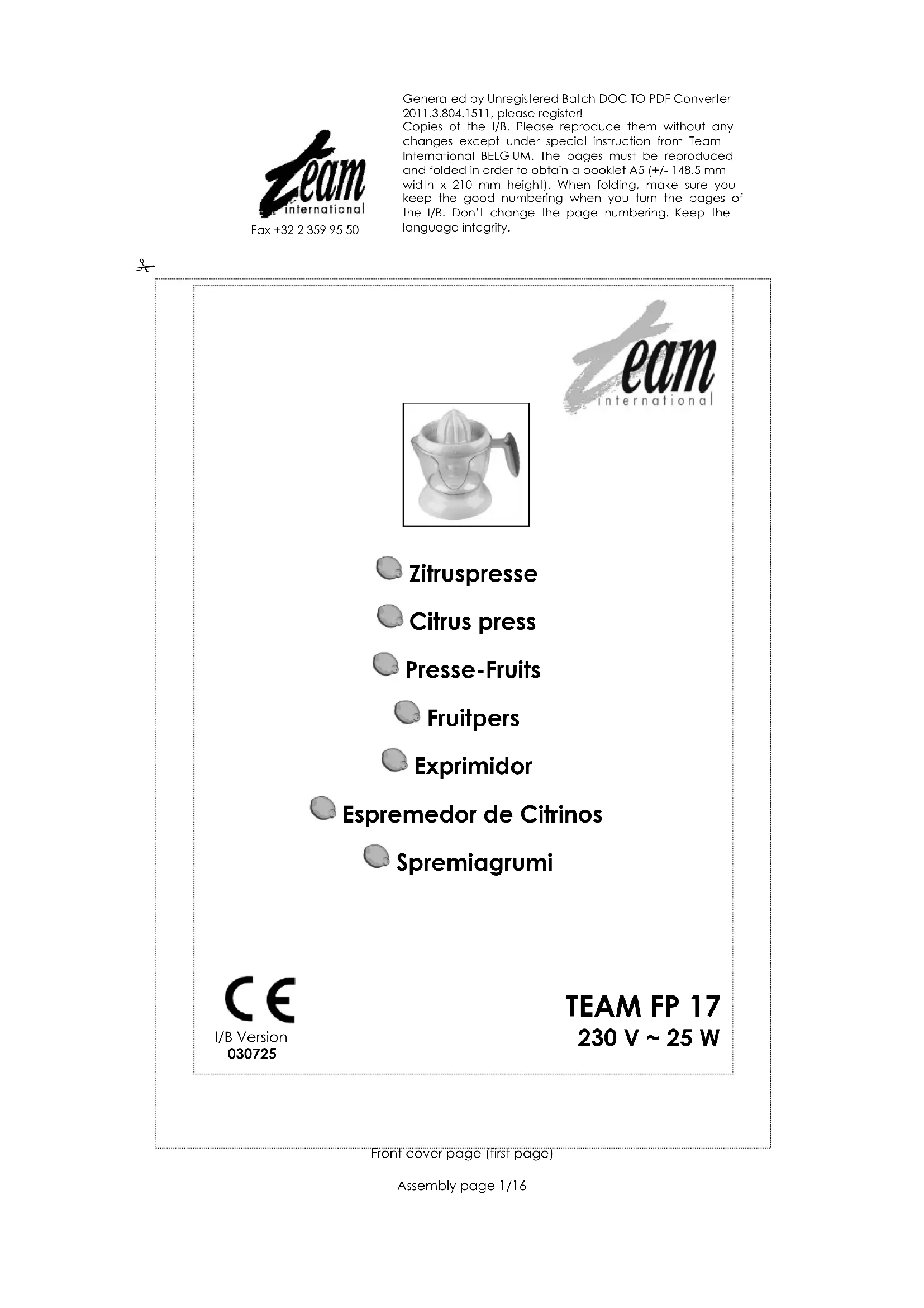 FP 17 - Extracteur de jus TEAM - Notice d'utilisation et mode d'emploi gratuit