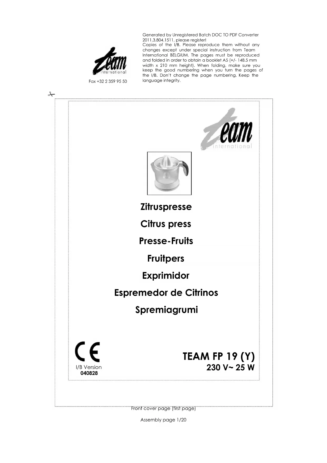 Démontez l'appareil ( récipient, filtre et cône ) tel qu’indiqué précédemment. Lavez les accessoires de votre appareil dans de l’eau savonneuse et rincez les à l’eau claire. Ne les placez pas au lave-vaisselle. Pour nettoyer le bloc moteur, utilisez un chiffon humide, si nécessaire. Ne le plongez jamais dans l'eau ou dans tout autre liquide. Copies of the I/B. Please reproduce them without any changes except under special instruction from Team International BELGIUM. The pages must be reproduced and folded in order to obtain a booklet A5 (+/- 148.5 mm width x 210 mm height). When folding, make sure you keep the good numbering when you turn the pages of the I/B. Don’t change the page numbering. Keep the language integrity.