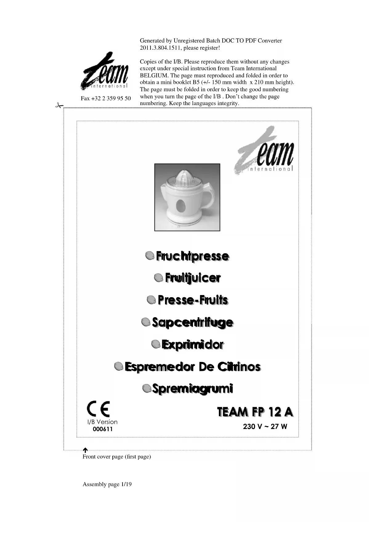 FP 12 - Extracteur de jus TEAM - Notice d'utilisation et mode d'emploi gratuit