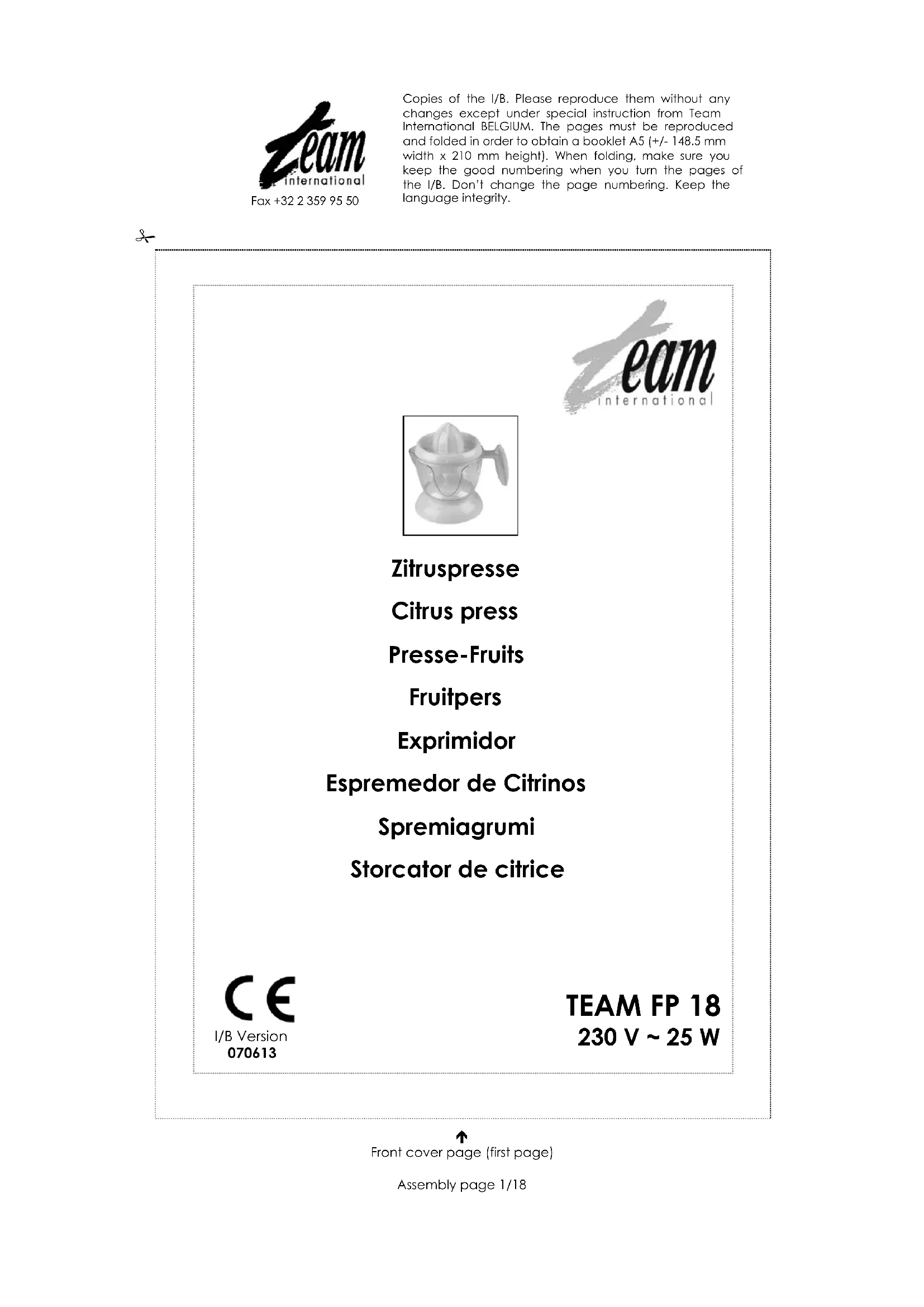 FP 18 - Extracteur de jus TEAM - Notice d'utilisation et mode d'emploi gratuit