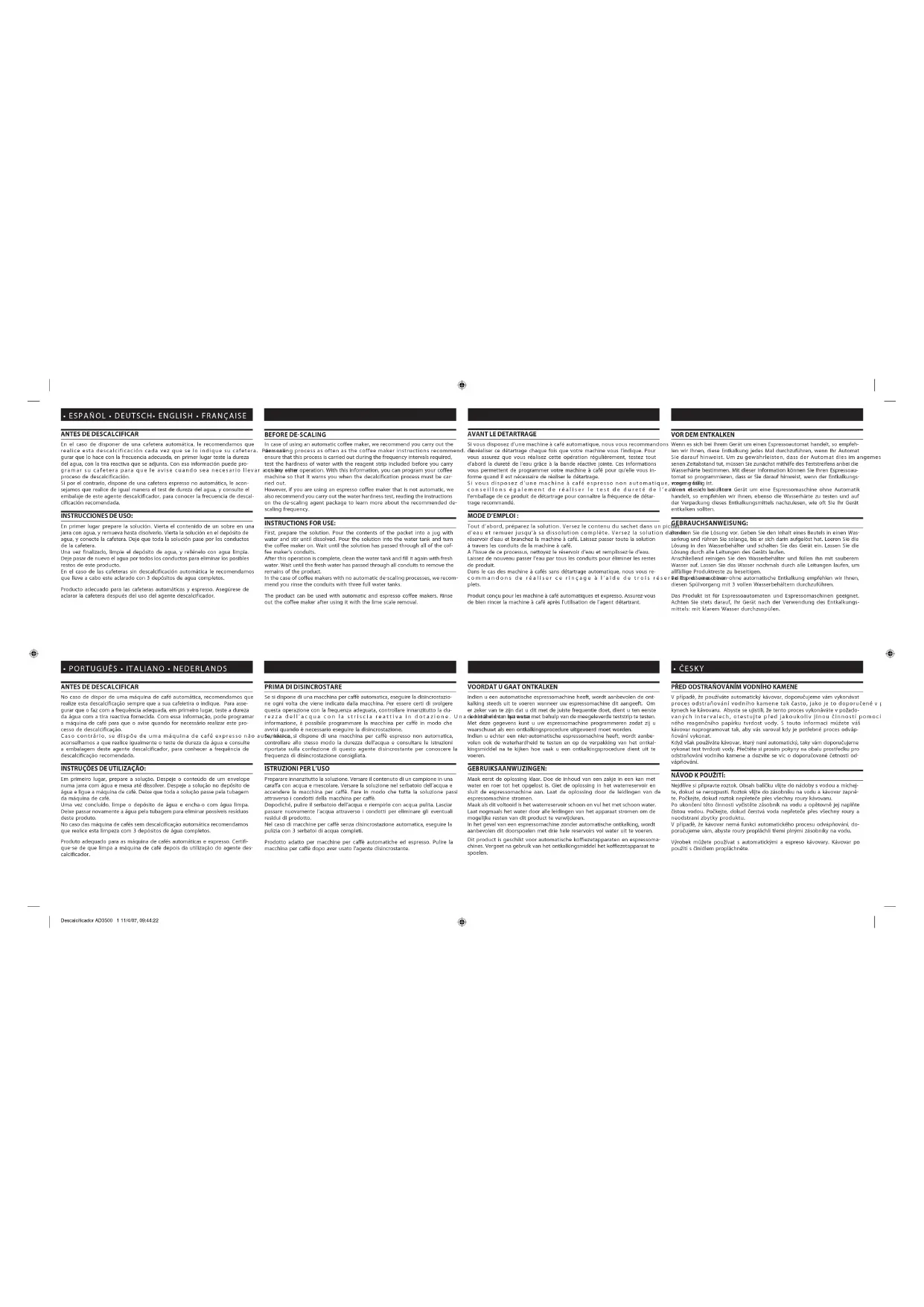 Si vous disposez d’une machine à café automatique, nous vous recommandons de réaliser ce détartrage chaque fois que votre machine vous l’indique. Pour vous assurez que vous réalisez cette opération régulièrement, testez tout d’abord la dureté de l’eau grâce à la bande réactive jointe. Ces informations vous permettent de programmer votre machine à café pour qu’elle vous in- forme quand il est nécessaire de réaliser le détartrage. Si vous disposez d’une machine à café espresso non automatique, nous vous conseillons également de réaliser le test de dureté de l’eau et de consulter l’emballage de ce produit de détartrage pour connaître la fréquence de détar- trage recommandé. MODE D’EMPLOI : Tout d’abord, préparez la solution. Versez le contenu du sachet dans un pichet d’eau et remuer jusqu’à sa dissolution complète. Versez la solution dans le réservoir d’eau et branchez la machine à café. Laissez passer toute la solution à travers les conduits de la machine à café. A l’issue de ce processus, nettoyez le réservoir d’eau et remplissez-le d’eau. Laissez de nouveau passer l’eau par tous les conduits pour éliminer les restes de produit. Dans le cas des machine à cafés sans détartrage automatique, nous vous re- commandons de réaliser ce rinçage à l’aide de trois réservoirs d’eau com- plets. Produit conçu pour les machine à café automatiques et expresso. Assurez-vous de bien rincer la machine à café après l’utilisation de l’agent détartrant.