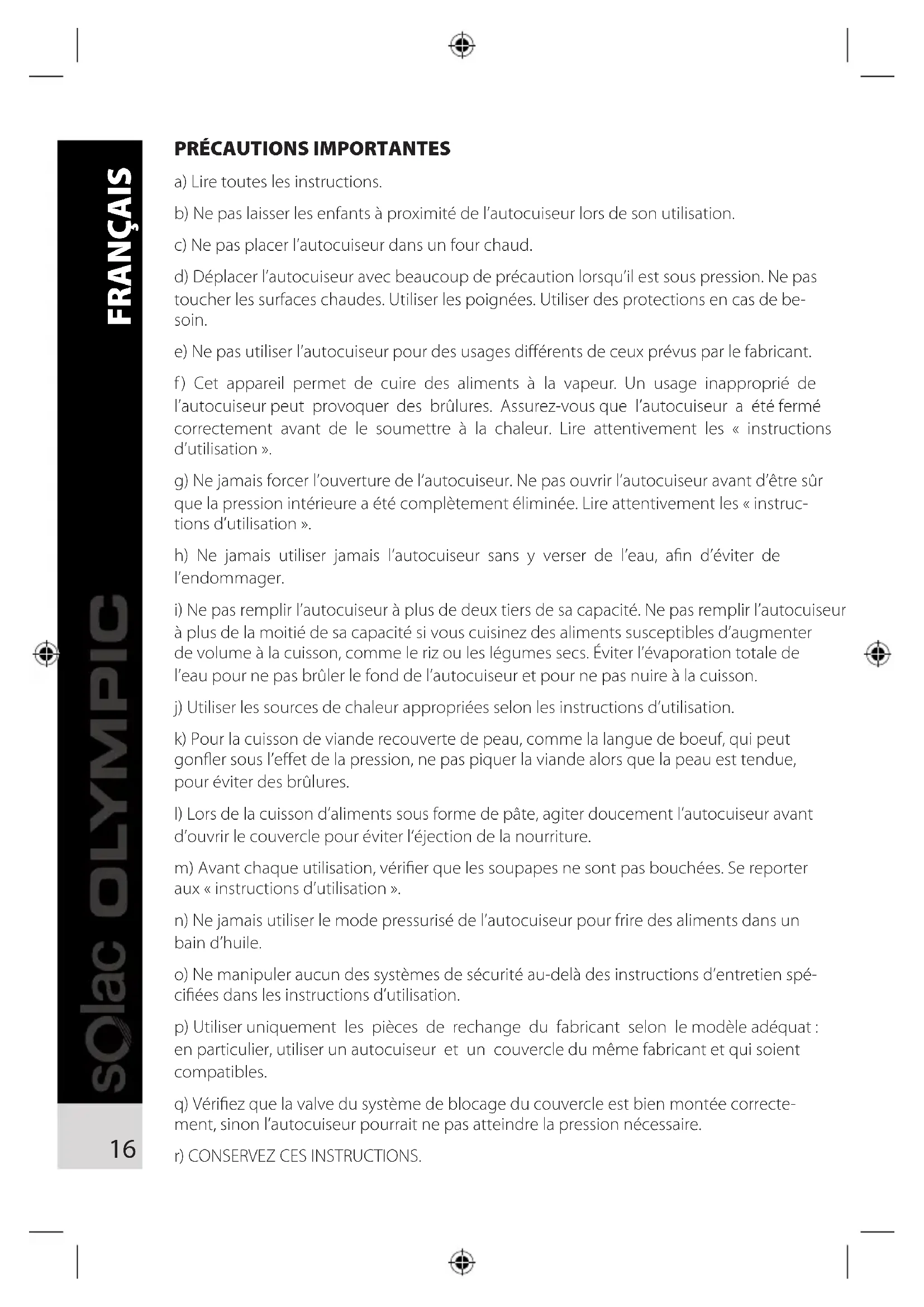 p) Utiliser uniquement les pieces de rechange du fabricant selon le modele adequat: en particulier, utiliser un autocuiseur et un couvercle du meme fabricant et qui soient compatibles.