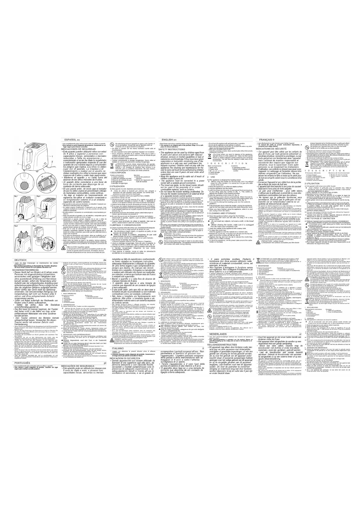 ATTENTION ! : Pour mettre l’appareil au rebut, NE LE JETEZ JAMAIS à la poubelle ; déposez-le dans un POINT DE RECYCLAGE ou à la déchetterie la plus proche afin qu’il y soit recyclé. Vous contribuerez ainsi à la préservation de l’environnement.1DESCRIPTION2 UTILISATIONZCet appareil a été conçu pour griller du pain.i Avant d'utiliser le grille-pain pour la première fois, faites-lefonctionner sans pain pendant quelques minutes. Il est normalqu'il fume légèrement au début.1 Posez l'appareil sur une surface lisse et stable.2 Branchez la fiche à la prise du secteur.3 Introduisez le pain dans les rainures (3) et réglez le degré depuissance souhaité en actionnant le bouton (7) (fig. 1). Le bouton(7) vous permet d’obtenir du pain plus ou moins grillé.4 Faites glisser vers le bas la commande de mise en marche (6) (fig. 2). 5 L'appareil s'arrêtera automatiquement quand le pain aura été grillé.A l’issue du processus, le bouton de mise en marche (6) retrouvesa position initiale, et le pain grillé apparaît dans la partiesupérieure des fentes d’introduction (fig. 3).ZSi pendant le processus de grillage, vous souhaitez l’interrompre, tournez le bouton jusqu’à 0. ZSi le pain reste bloqué à l'intérieur du grille-pain, débranchez l'appareil, attendez qu'il refroidisse et retirez le pain. 6 Lorsque vous avez fini d'utiliser l'appareil, laissez-le refroidir etdébranchez le câble de branchement électrique.3 NETTOYAGE ET ENTRETIENZNettoyez l’appareil avant sa première utilisation, immédiatement après chaque utilisation et après une longue période d’inutilisation.‹ N’introduisez aucun objet, même pas un chiffon, dans les fentesd’introduction du pain.‹ Avant de nettoyer le grille-pain, assurez-vous qu’il est débranchéet complètement froid.1 Nettoyez l'extérieur de l'appareil avec un chiffon sec.2 Pour nettoyer le plateau ramasse-miettes,placez l'appareil au-dessus de la poubelle ouverte ou de l'évier.3 Dégagez le plateau ramasse-miettes. Pour ceci, tournez lalanguette : le plateau s'ouvrira et les miettes et les restes de paintomberont. (fig. 4)4 Replacez le plateau et tournez la languette pour bloquer le plateauramasse-miettes. Assurez-vous qu'il est correctement placé.5 Pour ranger l’appareil, enroulez le câble dans l'espace prévu à ceteffet autour du support de la base.Principaux éléments 1 Corps principal 2 Cordon d'alimentation 3 Fentes d’introduction du pain 4 Enrouleur de câble 5 Plateau ramasse-miettes Boutons de fonctionnement 6 Bouton de mise en marche 7 Bouton support « réchauffe- pain » DEUTSCH de