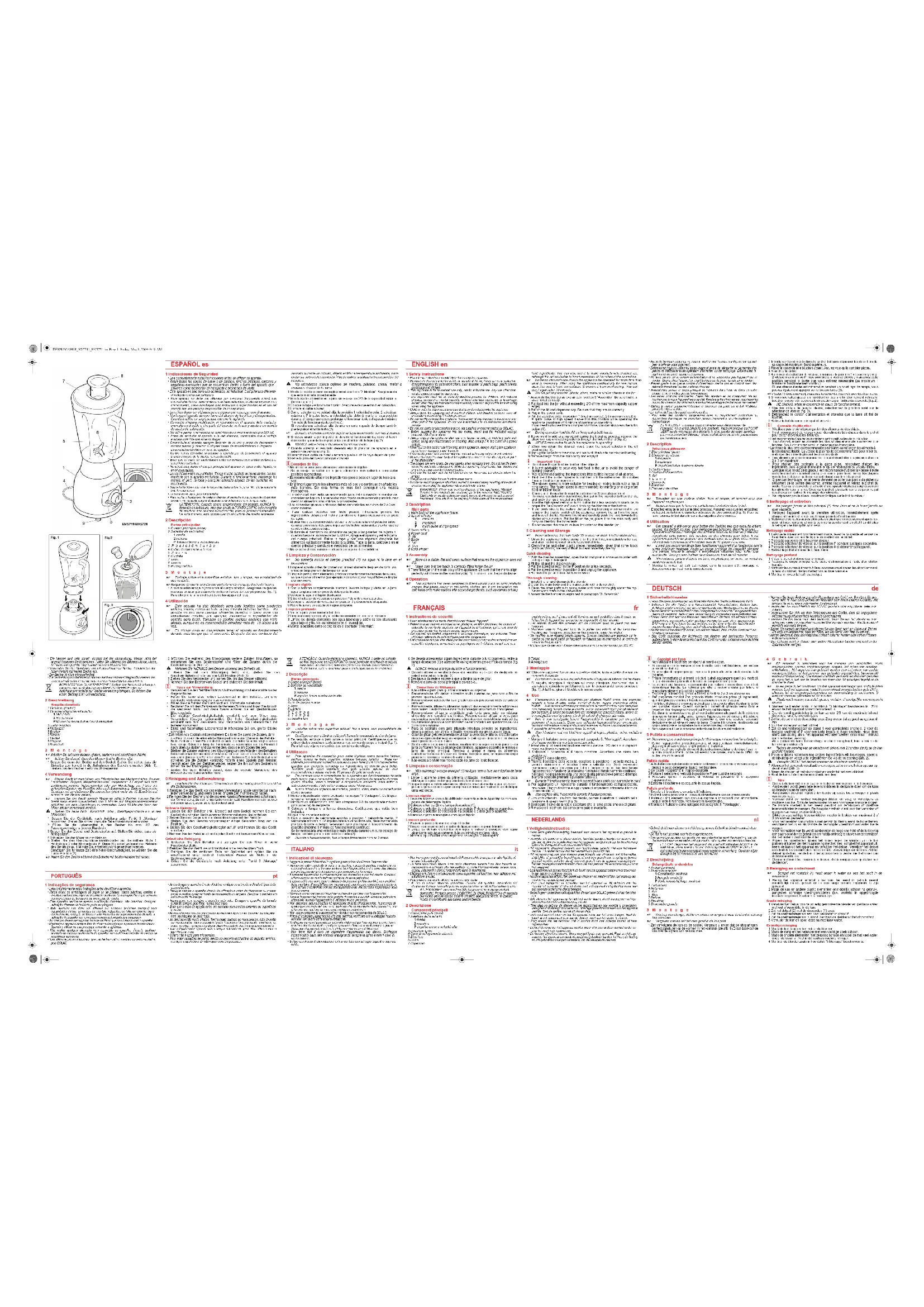 - To not use this jar to store food or other objects.• It is not advisable to pour very hot food in the jar to avoid the danger ofburning yourself.• We recommend adding the ingredients little by little instead of all at once. • First blend the harder ingredients and then add the softer ones. This makesit easier to obtain an even mix.• The slower speed is more suitable for beating or mixing foods with a liquidconsistency. The faster speed is recommended for mincing or mixing moresolid or thicker foods.• Coarse and fibrous foods must be cut into 2 or 3 cm cubes at most.• To make cocktails with crushed ice, first put in the ingredients then the ice,and lastly the liquid needed or a little water.• Use the high speed setting or turbo button for a few seconds to crush ice, topropel the ice upwards and avoid blocking the blender at the bottom.• If the foods stick to the walls of the jar during blending or remain out of therange of the blades, switch off the appliance, remove the jar from the baseand take off the lid. Remove the lid and carefully push the food towards theblades with a spatula. Put the lid on the jar, place it on the main body andcarry on blending the ingredients.• Do not exceed the maximum level indicated on the blender jar5 Cleaning and Storage Z Never submerse the main body (1) in water or wash it in the dishwasher. 1 Clean the appliance before using it for the first time, immediately after useand after not being used for a long period of time.2 Clean the jar and other plastic pieces immediately, given that some foods(such as carrots) are very difficult to clean once they are dry.Quick cleaning1 With the blender assembled, open the lid and pour in some warm water witha drop of liquid detergent.2 Fit the lid and the dispenser cap.3 Put the speed selector in the P position for a few seconds. 4 Put the speed selector in position 0 and unplug the appliance.5 Remove the jar and rinse with warm water.Thorough cleaning1 Empty the jar and dismantle the blender.2 Clean the main body and the mains cable with a damp cloth.3 Clean the other parts with soapy water and rinse thoroughly under the tap.Never wash them in the dishwasher.4 Assemble the blender as explained in paragraph “3. Assembly”. FRANÇAIS fr 1 Instructions de sécurité• Lisez attentivement ce mode d'emploi avant d'utiliser l'appareil.• Retirez tous les sachets en papier ou en plastique, les films plastiques, les cartons etautocollants éventuels, apposés sur l’appareil ou à l’extérieur, qui lui ont servi deprotection pendant le transport ou pour sa promotion.• Cet appareil est destiné uniquement à un usage domestique, non industriel. Touteutilisation différente de celle indiquée peut être dangereuse.• Cet appareil ne doit pas être utilisé par des personnes (y compris des enfants) dont lescapacités physiques, sensorielles ou psychiques sont réduites, ou qui sont peuexpérimentées, sauf si elles ont été formées ou sont contrôlées dans le cadre del'utilisation de l'appareil par une personne responsable de leur sécurité.• Les enfants doivent être surveillés afin de s’assurer qu’ils ne jouent pas avecl’appareil.• Maintenez toujours l'appareil hors de la portée des enfants et des personneshandicapées. Lorsque vous l’utilisez en leur présence, soyez très vigilant.• Ne modifiez ni ne réparez jamais l’appareil. Si vous constatez une anomalie sur lecordon ou une autre partie de l’appareil, ne l’utilisez pas et amenez-le à un centre deservice technique agréé.• N’utilisez pas de pièces ni d'accessoires non fournis ou recommandés par SOLAC.• Avant de brancher l’appareil au secteur, vérifiez que la tension indiquée correspondbien à celle de votre logement.• Débranchez toujours l’appareil après usage et avant de démonter ou de monter despièces et d'effectuer toute opération d’entretien ou de nettoyage. Débranchez-leégalement en cas de coupure de courant. • Ne tirez jamais sur le cordon d’alimentation et ne suspendez pas l’appareil par lecordon. Débranchez l’appareil en tirant toujours sur la prise, jamais sur le cordon.• Prenez garde à ce que le cordon d'alimentation n'entre pas en contact avec deséléments tranchants ou des surfaces chaudes.• N’introduisez jamais le corps principal de l’appareil dans l’eau ou dans un autreliquide, et ne le mettez pas au lave-vaisselle.• Les lames sont très tranchantes. Faites très attention en les manipulant. Ne lestouchez pas lorsque l’appareil est branché. Pendant le fonctionnement, maintenez lesmains, les cheveux, les vêtements et tout ustensile éloigné des lames en mouvement.• Utilisez le mixeur uniquement lorsque le couvercle est placé sur le bol. N’utilisezjamais le mixeur à vide. • Le bol ne doit pas être placé au micro-ondes.• Pour éviter des situations dangereuses dues au réajustement involontaire dudisjoncteur thermique, ne branchez jamais l’appareil à un interrupteur àtemporisateur. ATTENTION ! : Lorsque vous souhaitez vous débarrasser de l'appareil, ne le jetez JAMAIS à la poubelle, mais amenez-le au POINT VERT ou de recyclage des déchets le plus proche de votre domicile pour son traitement ultérieur. Vous contribuerez ainsi à la préservation de l’environnement.2 DescriptionPrincipaux éléments1 Bloc principal (base)2 Sélecteur de vitesse1 moyenne2 maximumP Impulsion brève à vitesse élevée3 Position turbo4 Cordon d’alimentation 5Bol 6Lame7 Couvercle8 Bouchon9 Enrouleur de câble3Montage Z Travaillez sur une surface stable, lisse et propre, et assurez-vous que l’appareil ne glisse pas. Z Assurez-vous que la lame est parfaitement emboîtée dans le bol. 1 Emboîtez ensuite le bol sur le bloc principal. Assurez-vous que les encochesse logent parfaitement dans les créneaux du bloc principal (fig. 1). Pour cefaire, tournez le bol dans le sens des aiguilles d’une montre. 4 Utilisation Z Cet appareil a été conçu pour b