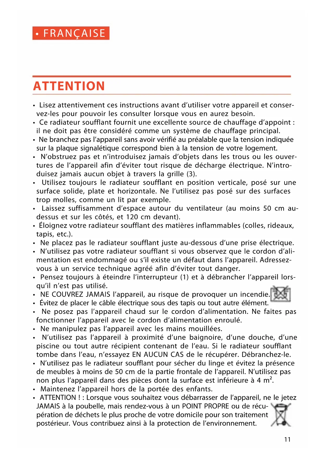- N'utilisez pas le radiateur soufflant pour sécher du linge et évitez la présence de meubles à moins de 50 cm de la partie frontale de l'appareil. N'utilisez pas non plus l'appareil dans des pièces dont la surface est inférieure à 4 m².