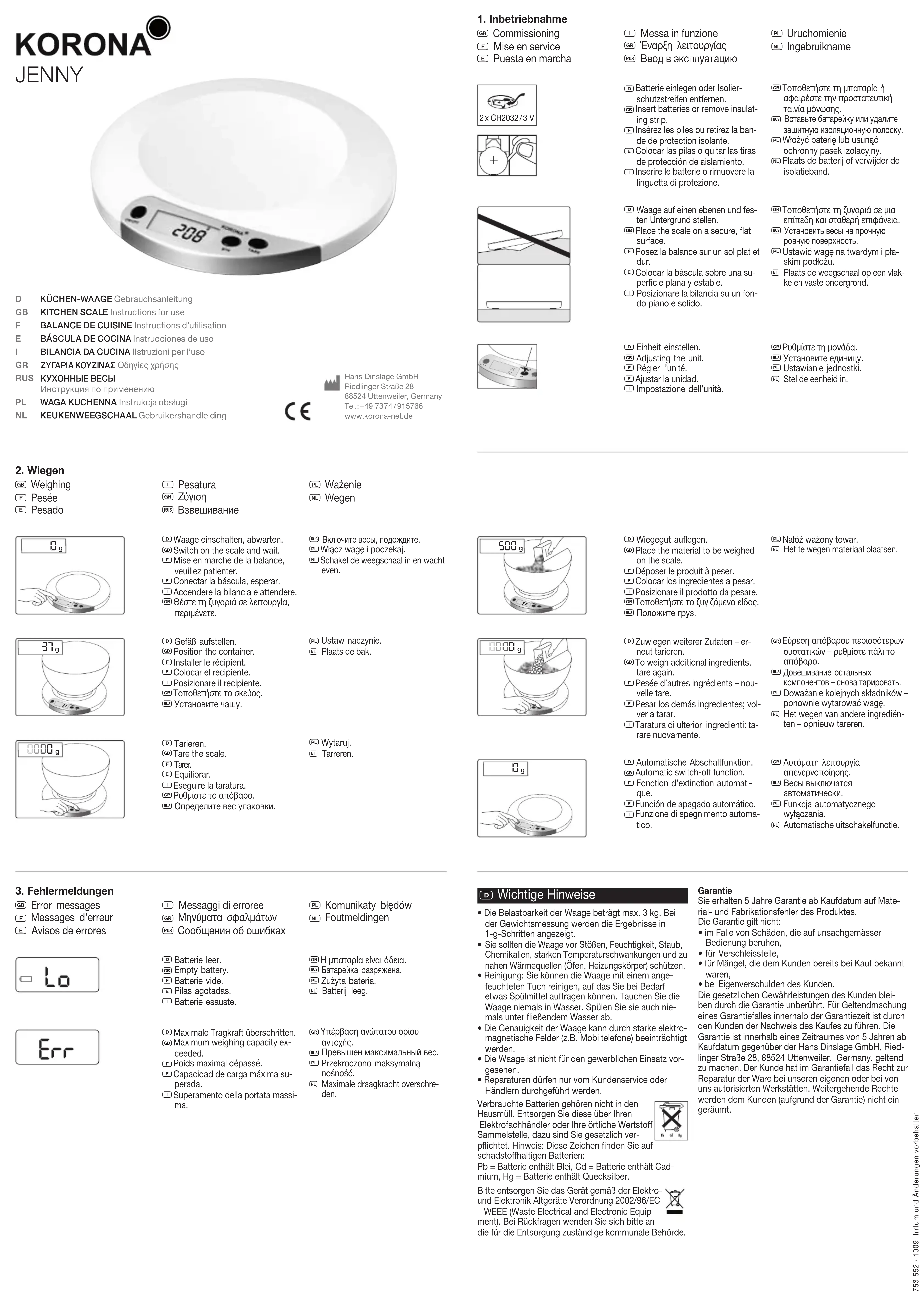Jenny 9524101 - Balances de cuisine KORONA - Notice d'utilisation et mode d'emploi gratuit