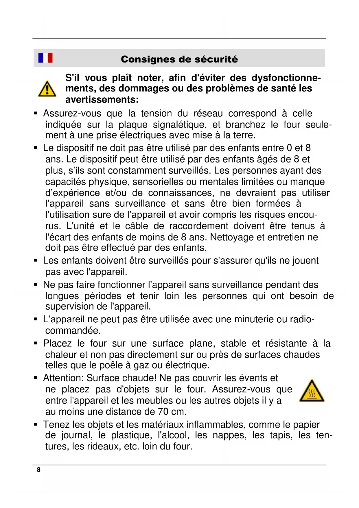 Assurez-vous que la tension du réseau correspond à celle indiquée sur la plaque signalétique, et branchez le four seule- ment à une prise électriques avec mise à la terre. Le dispositif ne doit pas être utilisé par des enfants entre 0 et 8 ans. Le dispositif peut être utilisé par des enfants âgés de 8 et plus, s’ils sont constamment surveillés. Les personnes ayant des capacités physique, sensorielles ou mentales limitées ou manque d’expérience et/ou de connaissances, ne devraient pas utiliser l’appareil sans surveillance et sans être bien formées à l’utilisation sure de l’appareil et avoir compris les risques encou- rus. L'unité et le câble de raccordement doivent être tenus à l'écart des enfants de moins de 8 ans. Nettoyage et entretien ne doit pas être effectué par des enfants. Les enfants doivent être surveillés pour s'assurer qu'ils ne jouent pas avec l'appareil. Ne pas faire fonctionner l'appareil sans surveillance pendant des longues périodes et tenir loin les personnes qui ont besoin de supervision de l'appareil. L’appareil ne peut pas être utilisée avec une minuterie ou radio- commandée. Placez le four sur une surface plane, stable et résistante à la chaleur et non pas directement sur ou près de surfaces chaudes telles que le poêle à gaz ou électrique. Attention: Surface chaude! Ne pas couvrir les évents et ne placez pas d'objets sur le four. Assurez-vous que entre l'appareil et les meubles ou les autres objets il y a au moins une distance de 70 cm. Tenez les objets et les matériaux inflammables, comme le papier de journal, le plastique, l'alcool, les nappes, les tapis, les ten- tures, les rideaux, etc. loin du four.