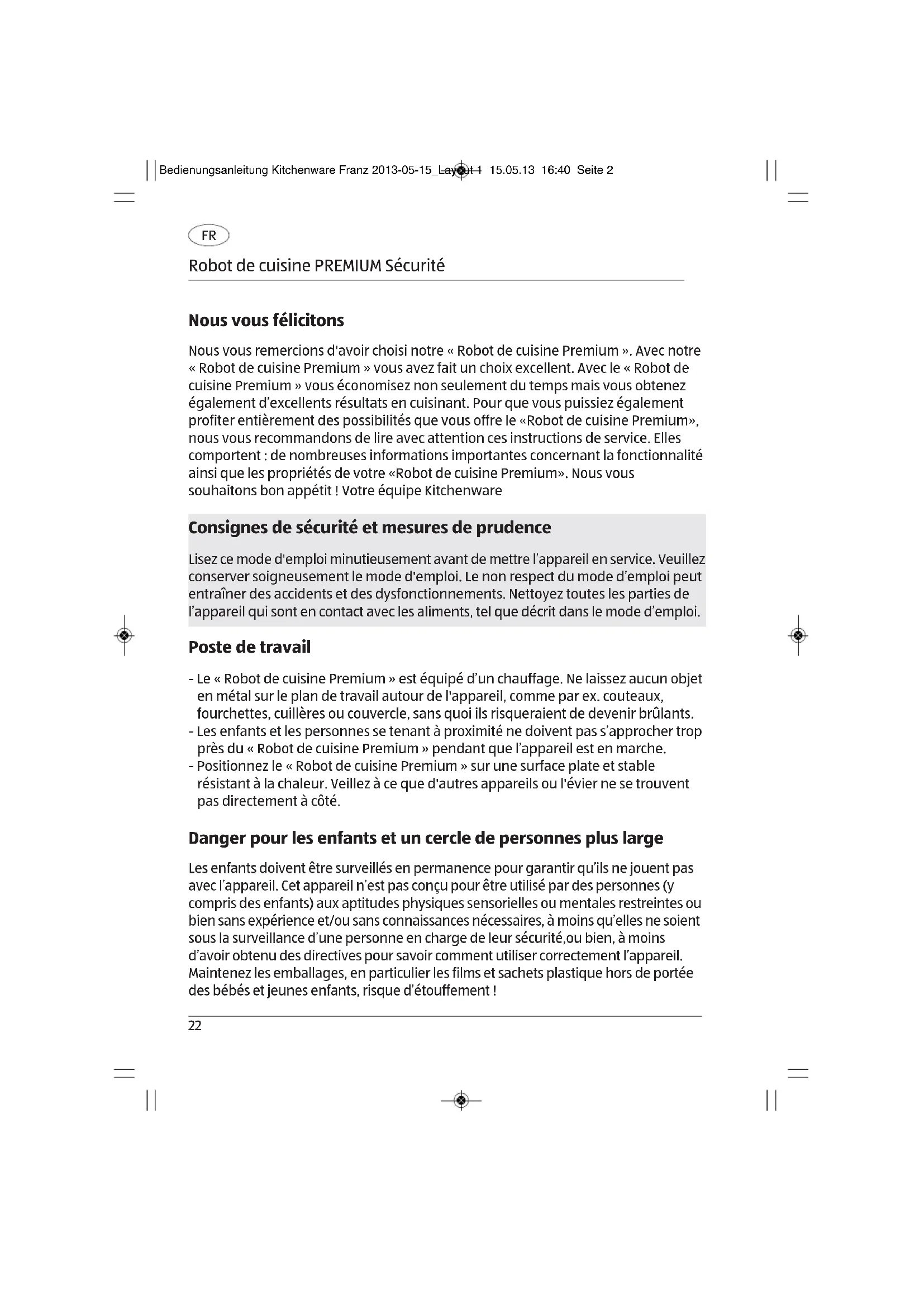 Nous vous félicitons Nous vous remercions d'avoir choisi notre « Robot de cuisine Premium ». Avec notre « Robot de cuisine Premium » vous avez fait un choix excellent. Avec le « Robot de cuisine Premium » vous économisez non seulement du temps mais vous obtenez également d’excellents résultats en cuisinant. Pour que vous puissiez également profiter entièrement des possibilités que vous offre le «Robot de cuisine Premium», nous vous recommandons de lire avec attention ces instructions de service. Elles comportent : de nombreuses informations importantes concernant la fonctionnalité ainsi que les propriétés de votre «Robot de cuisine Premium». Nous vous souhaitons bon appétit ! Votre équipe Kitchenware Consignes de sécurité et mesures de prudence Lisez ce mode d'emploi minutieusement avant de mettre l’appareil en service. Veuillez conserver soigneusement le mode d'emploi. Le non respect du mode d’emploi peut entraîner des accidents et des dysfonctionnements. Nettoyez toutes les parties de l’appareil qui sont en contact avec les aliments, tel que décrit dans le mode d’emploi. Poste de travail - Le « Robot de cuisine Premium » est équipé d’un chauffage. Ne laissez aucun objet en métal sur le plan de travail autour de l'appareil, comme par ex. couteaux, fourchettes, cuillères ou couvercle, sans quoi ils risqueraient de devenir brûlants. - Les enfants et les personnes se tenant à proximité ne doivent pas s’approcher trop près du « Robot de cuisine Premium » pendant que l’appareil est en marche. - Positionnez le « Robot de cuisine Premium » sur une surface plate et stable résistant à la chaleur. Veillez à ce que d'autres appareils ou l'évier ne se trouvent pas directement à côté. Danger pour les enfants et un cercle de personnes plus large Les enfants doivent être surveillés en permanence pour garantir qu’ils ne jouent pas avec l’appareil. Cet appareil n’est pas conçu pour être utilisé par des personnes (y compris des enfants) aux aptitudes physiques sensorielles ou mentales restreintes ou bien sans expérience et/ou sans connaissances nécessaires, à moins qu’elles ne soient sous la surveillance d’une personne en charge de leur sécurité,ou bien, à moins d’avoir obtenu des directives pour savoir comment utiliser correctement l’appareil. Maintenez les emballages, en particulier les films et sachets plastique hors de portée des bébés et jeunes enfants, risque d’étouffement ! Bedienungsanleitung Kitchenware Franz 2013-05-15_Layout 1 15.05.13 16:40 Seite 2Française