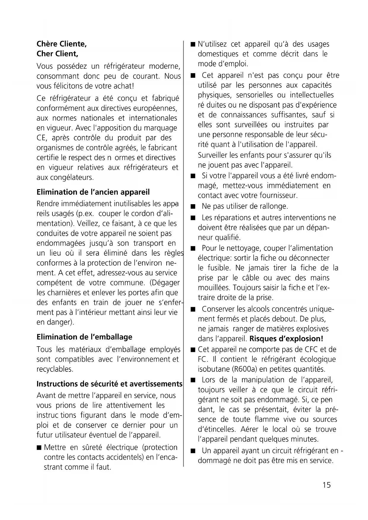 N’utilisez cet appareil qu’à des usages domestiques et comme décrit dans le mode d’emploi. ■ Cet appareil n'est pas conçu pour être utilisé par les personnes aux capacités physiques, sensorielles ou intellectuelles ré duites ou ne disposant pas d'expérience et de connaissances suffisantes, sauf si elles sont surveillées ou instruites par une personne responsable de leur sécu- rité quant à l'utilisation de l'appareil. Surveiller les enfants pour s'assurer qu'ils ne jouent pas avec l'appareil. ■ Si votre l'appareil vous a été livré endom- magé, mettez-vous immédiatement en contact avec votre fournisseur. ■ Ne pas utiliser de rallonge. ■ Les réparations et autres interventions ne doivent être réalisées que par un dépan- neur qualifié. ■ Pour le nettoyage, couper l’alimentation électrique: sortir la fiche ou déconnecter le fusible. Ne jamais tirer la fiche de la prise par le câble ou avec des mains mouillées. Toujours saisir la fich e et l’ex- traire droite de la prise. ■ Conserver les alcools concentrés unique- ment fermés et placés debout. De plus, ne jamais ranger de matières explosives dans l’appareil. Risques d’explosion!