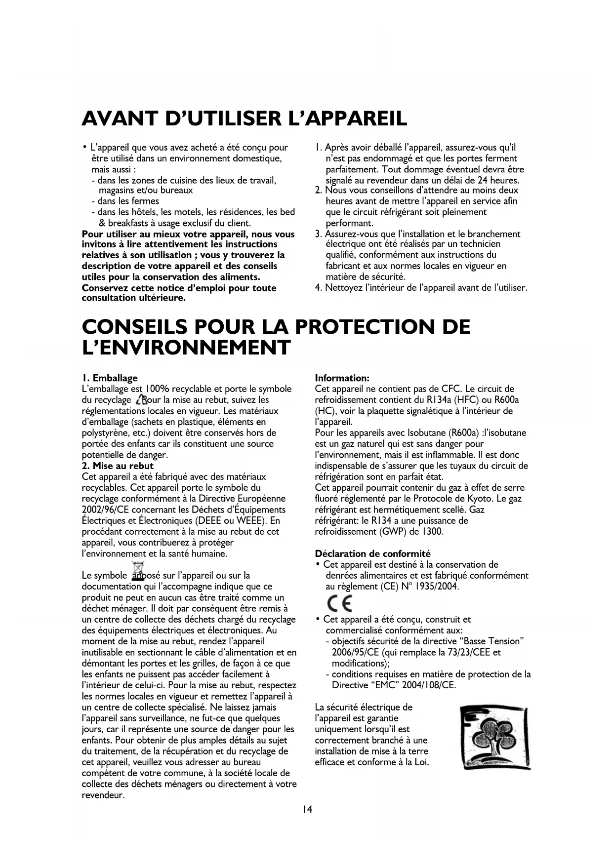 - Cet appareil est destiné à la conservation de denrées alimentaires et est fabriqué conformément au règlement (CE) N° 1935/2004.