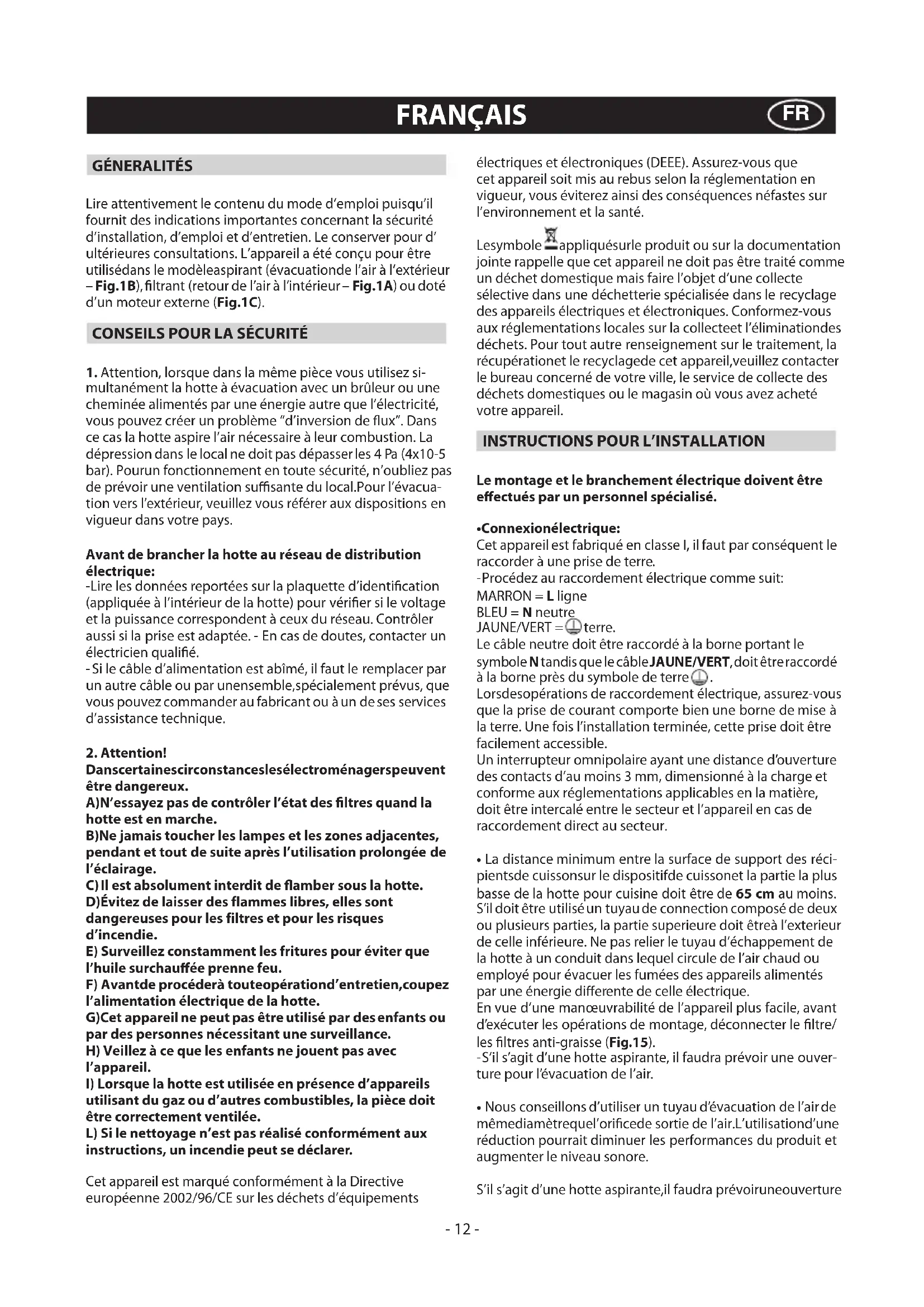 multanément la hotte à évacuation avec un brûleur ou une cheminée alimentés par une énergie autre que l’électricité, vous pouvez créer un problème “d’inversion de ux”. Dans ce cas la hotte aspire l’air nécessaire à leur combustion. La dépression dans le local ne doit pas dépasser les 4 Pa (4x10-5 bar). Pourun fonctionnement en toute sécurité, n’oubliez pas de prévoir une ventilation susante du local.Pour l’évacua- tion vers l’extérieur, veuillez vous référer aux dispositions en vigueur dans votre pays. Avant de brancher la hotte au réseau de distribution électrique: -Lire les données reportées sur la plaquette d’identication (appliquée à l’intérieur de la hotte) pour vérier si le voltage et la puissance correspondent à ceux du réseau. Contrôler aussi si la prise est adaptée. - En cas de doutes, contacter un électricien qualié. -Si le câble d’alimentation est abîmé, il faut le remplacer par un autre câble ou par unensemble,spécialement prévus, que vous pouvez commander au fabricant ou à un de ses services d’assistance technique.