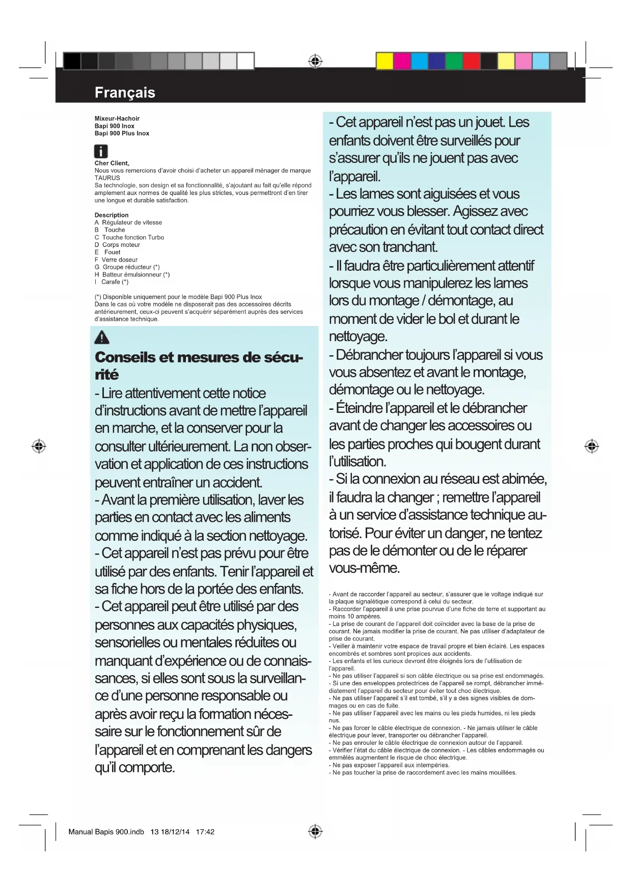 Mashed potato 20 400 g The potatoes can be sliced by activating the blender directly in the saucepan directly. 30 s Baby food: fruit and biscuit mush 20 300 g Cut up and place 100 gr. of apple, 100 gr. of banana, 50 gr. of biscuits and the juice of one orange in the jug 25 s Breadcrumbs 20 50 g Cut up the stale bread before putting it in the jug. Blend until the desired texture is obtained. 50 s Grated cheese 20 200 g Dice the cheese into 1 cm chunks and blend until the desired texture is obtai- ned.20110704~101833 30 – 40 s Chopped carrot 20 300 g Dice the cheese into 1 cm chunks and blend until the desired texture is obtained. 20 s Ground nuts 20 300 g Remove the shells and grind until the desired texture is obtained 20 s Chopped boiled egg 20 5 eggs Cut into quarters and chop until the desired texture is obtained. 10 s Chopped meat (raw or cooked) 20 300 KG. Previously chop into 1 cm chunks Mince until the desired texture is obtained 30 s Minced meat 20 40 g Previously chop into 1 cm chunks Mince until the desired texture is obtained 3 s Tomato juice 20 400 g Cut the tomatoes into quarters, put them into the strainer and work them until the juice is left in the goblet 20 s Chopped Spa- nish Serrano ham 20 60 g Previously chop into 1 cm chunks Mince until the desired texture is obtained 3 s Chopped dried apricots TURBO 60 g Previously chop into 1 cm chunks Mince until the desired texture is obtained 3 s Manual Bapis 900.indb 12 18/12/14 17:42Français Mixeur-Hachoir Bapi 900 Inox Bapi 900 Plus Inox Cher Client, Nous vous remercions d’avoir choisi d’acheter un appareil ménager de marque TAURUS Sa technologie, son design et sa fonctionnalité, s’ajoutant au fait qu’elle répond amplement aux normes de qualité les plus strictes, vous permettront d’en tirer une longue et durable satisfaction. Description A Régulateur de vitesse B Touche C Touche fonction Turbo D Corps moteur E Fouet F Verre doseur G Groupe réducteur (*) H Batteur émulsionneur (*) I Carafe (*) (*) Disponible uniquement pour le modèle Bapi 900 Plus Inox Dans le cas où votre modèle ne disposerait pas des accessoires décrits antérieurement, ceux-ci peuvent s’acquérir séparément auprès des services d’assistance technique. Conseils et mesures de sécu- rité - Lire attentivement cette notice d’instructions avant de mettre l’appareil en marche, et la conserver pour la consulter ultérieurement. La non obser- vation et application de ces instructions peuvent entraîner un accident. - Avant la première utilisation, laver les parties en contact avec les aliments comme indiqué à la section nettoyage. - Cet appareil n’est pas prévu pour être utilisé par des enfants. Tenir l’appareil et sa fiche hors de la portée des enfants. - Cet appareil peut être utilisé par des personnes aux capacités physiques, sensorielles ou mentales réduites ou manquant d’expérience ou de connais- sances, si elles sont sous la surveillan- ce d’une personne responsable ou après avoir reçu la formation néces- saire sur le fonctionnement sûr de l’appareil et en comprenant les dangers qu’il comporte. - Cet appareil n’est pas un jouet. Les enfants doivent être surveillés pour s’assurer qu’ils ne jouent pas avec l’appareil. - Les lames sont aiguisées et vous pourriez vous blesser. Agissez avec précaution en évitant tout contact direct avec son tranchant. - Il faudra être particulièrement attentif lorsque vous manipulerez les lames lors du montage / démontage, au moment de vider le bol et durant le nettoyage. - Débrancher toujours l’appareil si vous vous absentez et avant le montage, démontage ou le nettoyage. - Éteindre l’appareil et le débrancher avant de changer les accessoires ou les parties proches qui bougent durant l’utilisation. - Si la connexion au réseau est abimée, il faudra la changer ; remettre l’appareil à un service d’assistance technique au- torisé. Pour éviter un danger, ne tentez pas de le démonter ou de le réparer vous-même. - Avant de raccorder l’appareil au secteur, s’assurer que le voltage indiqué sur la plaque signalétique correspond à celui du secteur. - Raccorder l’appareil à une prise pourvue d’une che de terre et supportant au moins 10 ampères. - La prise de courant de l’appareil doit coïncider avec la base de la prise de courant. Ne jamais modier la prise de courant. Ne pas utiliser d’adaptateur de prise de courant. - Veiller à maintenir votre espace de travail propre et bien éclairé. Les espaces encombrés et sombres sont propices aux accidents. - Les enfants et les curieux devront être éloignés lors de l’utilisation de l’appareil. - Ne pas utiliser l’appareil si son câble électrique ou sa prise est endommagés. - Si une des enveloppes protectrices de l’appareil se rompt, débrancher immé- diatement l’appareil du secteur pour éviter tout choc électrique. - Ne pas utiliser l’appareil s’il est tombé, s’il y a des signes visibles de dom- mages ou en cas de fuite. - Ne pas utiliser l’appareil avec les mains ou les pieds humides, ni les pieds nus. - Ne pas forcer le câble électrique de connexion. - Ne jamais utiliser le câble électrique pour lever, transporter ou débrancher l’appareil. - Ne pas enrouler le câble électrique de connexion autour de l’appareil. - Vérier l’état du câble électrique de connexion. - Les câbles endommagés ou emmêlés augmentent le risque de choc électrique. - Ne pas exposer l’appareil aux intempéries. - Ne pas toucher la prise de raccordement avec les mains mouillées. Manual Bapis 900.indb 13 18/12/14 17:42- Prendre les précautions nécessaires pour éviter de mettre en marche involon- tairement l’appareil. - Ne pas toucher les parties mobiles de l’appareil en marche. Utilisation et précautions : - Ne pas utiliser l’appareil si ses accessoires ne sont pas dûment accouplés. - Ne pas utiliser l’appareil à vide, c’est à dire sans charge