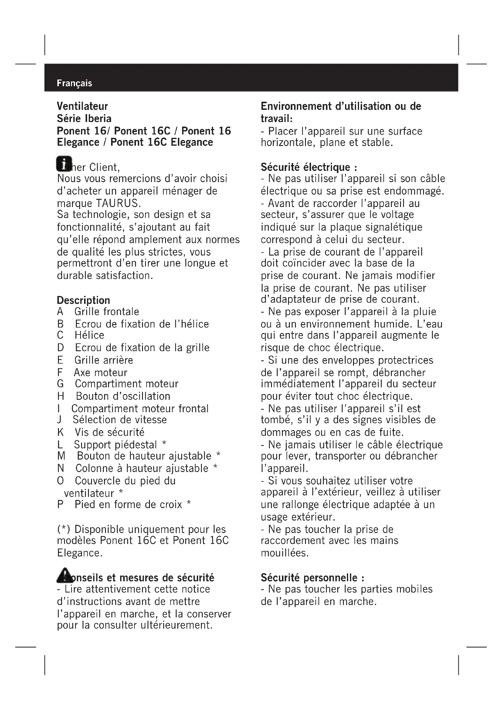 M Bouton de hauteur ajustable * N Colonne à hauteur ajustable * O Couvercle du pied du ventilateur * P Pied en forme de croix * (*) Disponible uniquement pour les modèles Ponent 16C et Ponent 16C Elegance. Conseils et mesures de sécurité - Lire attentivement cette notice d’instructions avant de mettre l’appareil en marche, et la conserver pour la consulter ultérieurement. Environnement d’utilisation ou de travail: - Placer l’appareil sur une surface horizontale, plane et stable. Sécurité électrique : - Ne pas utiliser l’appareil si son câble électrique ou sa prise est endommagé. - Avant de raccorder l’appareil au secteur, s’assurer que le voltage indiqué sur la plaque signalétique correspond à celui du secteur. - La prise de courant de l’appareil doit coïncider avec la base de la prise de courant. Ne jamais modifier la prise de courant. Ne pas utiliser d’adaptateur de prise de courant. - Ne pas exposer l’appareil à la pluie ou à un environnement humide. L’eau qui entre dans l’appareil augmente le risque de choc électrique. - Si une des enveloppes protectrices de l’appareil se rompt, débrancher immédiatement l’appareil du secteur pour éviter tout choc électrique. - Ne pas utiliser l’appareil s’il est tombé, s’il y a des signes visibles de dommages ou en cas de fuite. - Ne jamais utiliser le câble électrique pour lever, transporter ou débrancher l’appareil. - Si vous souhaitez utiliser votre appareil à l’extérieur, veillez à utiliser une rallonge électrique adaptée à un usage extérieur. - Ne pas toucher la prise de raccordement avec les mains mouillées. Sécurité personnelle : - Ne pas toucher les parties mobiles de l’appareil en marche.Utilisation et précautions : - Avant chaque utilisation, dérouler complètement le câble d’alimentation de l’appareil. - Ne pas utiliser l’appareil si son dispositif de mise en marche/arrêt ne fonctionne pas. - Ne pas faire bouger l’appareil en cours de fonctionnement - Utiliser les poignées prévues pour soutenir ou transporter l’appareil. - Si vous utilisez l’appareil dans une salle de bain ou endroit similaire, débranchez-le du secteur lorsque vous ne l’utilisez pas, même pour un court instant, car la proximité de l’eau présente un risque, même si l’appareil est déconnecté. - Débrancher l’appareil du secteur tant qu’il reste hors d’usage et avant de procéder à toute opération de nettoyage. - Cet appareil est uniquement destiné à un usage domestique et non professionnel ou industriel. - Les enfants doivent être surveillés pour s’assurer qu’ils ne jouent pas avec l’appareil. -Ne pas laisser des personnes non familiarisées avec ce type de produit, des personnes handicapées ou des enfants l’utiliser - Laisser l’appareil hors de portée des enfants et/ou des personnes handicapées. - Ne pas utiliser l’appareil sur des animaux domestiques ou tout animal. - Toute utilisation inappropriée ou non conforme aux instructions d’utilisation annule la garantie et la responsabilité du fabricant. Installation - La fiche devra être facilement accessible pour pouvoir la débrancher en cas d’urgence. - L’appareil fonctionnera correctement lorsqu’il sera accouplé à son socle. Montage du socle : - Fixer le socle de la colonne en la maintenant à l’aide des vis fournies (Fig. 1). (Uniquement pour les modèles à colonne). - Pour monter le socle, il suffit de placer l’appareil à l’envers. - Accoupler le socle au corps de l’appareil. - Fixer le socle à l’aide des papillons fournis à cet effet (Fig. 2) - Remettre l’appareil à l’endroit et vérifier que le socle fonctionne correctement. Montage de la grille et de l’hélice : - Placer la grille arrière (E) dans le site moteur (G), en l’ajustant à ses points de jonction. - Appuyer sur l’écrou de fixation de la grille (D) afin de s’assurer qu’elle est correctement placée. - Placer l’hélice (C) dans l’axe moteur (F).). - Appuyer sur l’écrou de fixation de l’hélice (B), afin de s’assurer qu’elle est correctement placée. - Placer la grille frontale (A) devant la grille arrière (E), en faisant attention à la position de la vis de sécurité. Fixer la grille avant à l’aide des crochets et en appuyant sur la vis de sécurité (K) avec un tournevis. - Vérifier que l’hélice tourne sans obstructions.Mode d’emploi Usage : - Dérouler complètement le câble avant de le brancher. - Accoupler correctement l’appareil à son socle / connecteur. - Brancher l’appareil au secteur. - Placer l’appareil pour diriger le flux d’air vers la direction désirée. - Mettre en marche l’appareil en actionnant un des boutons de sélection de vitesse. Fonction oscillation : - La fonction oscillation permet de diriger le flux d’air qui sort de l’appareil pour couvrir de manière alternée et automatique un rayon de 75º - Pour activer cette fonction, appuyez sur le bouton (H). - Pour la désactiver, effectuer l’opération inverse. Lorsque vous avez fini de vous servir de l’appareil: - Arrêter l’appareil, en plaçant la commande de sélection sur la position