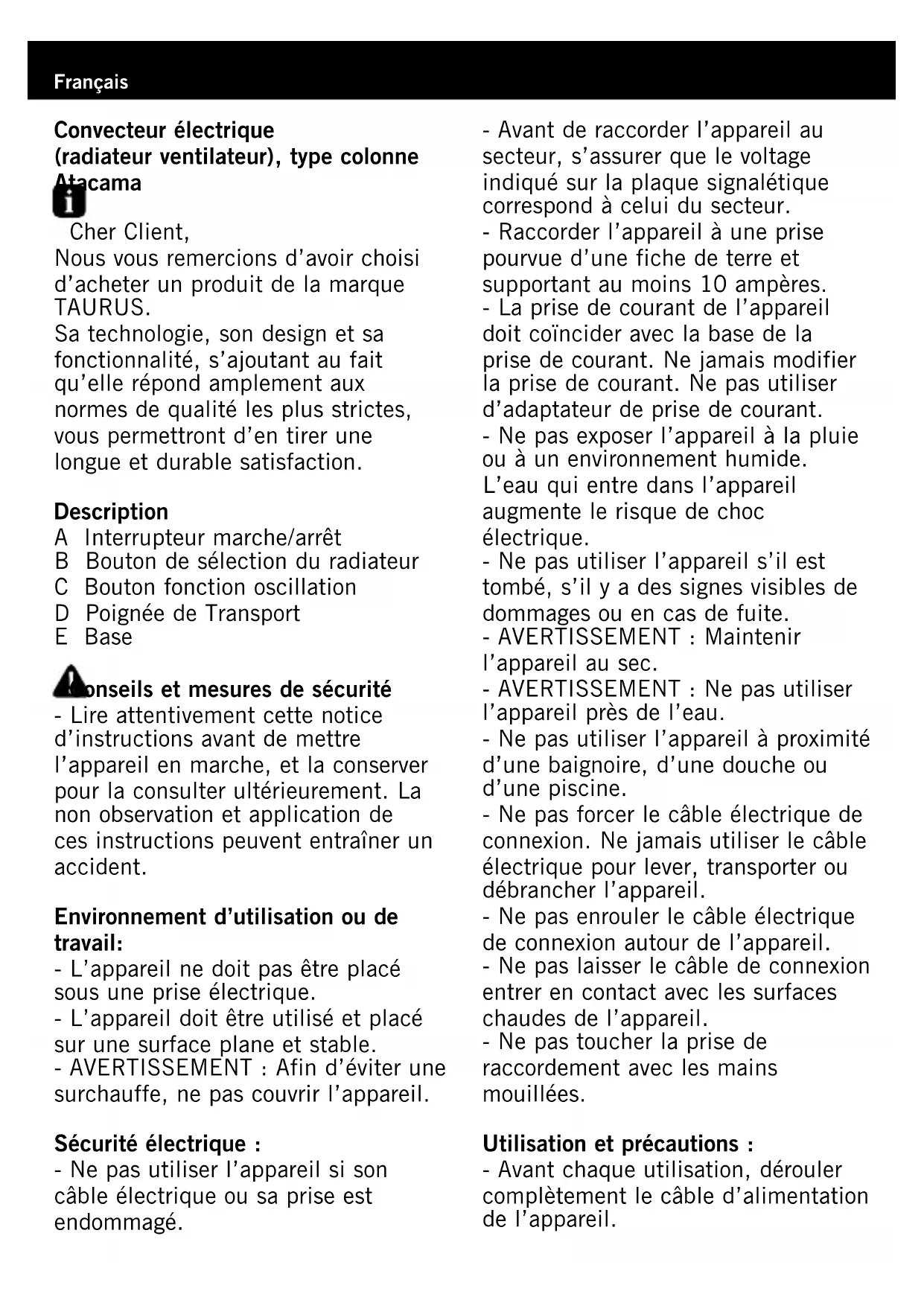 Atacama - Ventilateur TAURUS - Notice d'utilisation et mode d'emploi gratuit