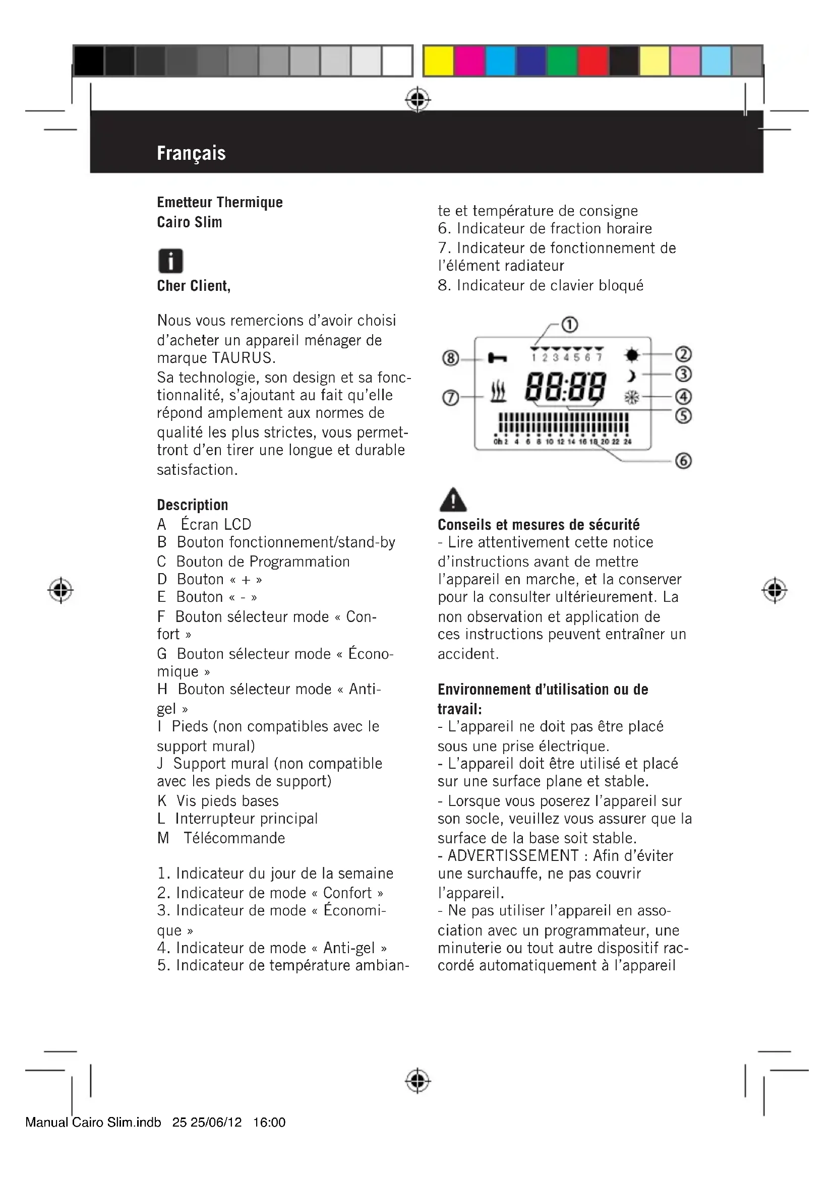 mmation de l’appareil, les éléments radiateurs ne fonctionneront pas. - Lorsque l’appareil sera sous le mode de programmation, pour passer au mode manuel, il suffira d’appuyer deux fois sur le bouton de fonction- nement/standby, puis, appuyer sur le bouton de programmation. - Pour revenir au mode Programma- tion, il suffira d’appuyer sur le bouton de programmation. Écran rétro-éclairé L’appareil dispose d’un écran LCD rétro-éclairé pour faciliter son utilisation. Lorsque l’appareil est allumé, l’écran s’éclaire lorsque vous appuyez sur n’importe quel bouton. Blocage du clavier - Pour éviter tout changement accidentel dans le système de programmation lors du nettoyage de l’appareil, il dispose d’un blocage au- tomatique du clavier après 1 minute d’inactivité. - Pour débloquer le clavier, il suffira d’appuyer sur le bouton «– » pendant 5 secondes. Lorsque vous avez fini de vous servir de l’appareil: - Mettre l’appareil en mode stand-by, en appuyant sur le bouton fonction- nement/stand-by. - Arrêter l’appareil en appuyant sur l’interrupteur de marche/arrêt. - Débrancher l’appareil du secteur. - Nettoyer l’appareil. Protecteur thermique de sûreté: - L’appareil dispose d’un dispositif thermique de sûreté qui protège l’appareil de toute surchauffe. - Lorsque l’appareil s’allume et s’éteint alternativement, et ce, n’étant pas du à l’action du ther- mostat ambiant, veiller à vérifier qu’aucun obstacle n’empêche ou ne gêne l’entrée ou la sortie normale de l’air. - Si l’appareil se déconnecte tout seul et que vous ne parvenez pas à le re- connecter, débranchez-le et attendez Manual Cairo Slim.indb 30 25/06/12 16:00environ 15 minutes avant de le re- brancher. S’il ne fonctionne toujours pas, faites appel à l’un des services d’assistance technique autorisés. Nettoyage - Débrancher l’appareil du secteur et attendre son complet refroidissement avant de la nettoyer. - Nettoyer l’appareil électrique et son cordon d’alimentation avec un chiffon humide et bien les sécher ensuite. NE JAMAIS IMMERGER l’APPAREIL NI LE CORDON DANS L’EAU NI AUCUN AUTRE LIQUIDE. - Nettoyer le dispositif électrique avec un chiffon humide et le laisser sécher. - Ne pas utiliser de solvants ni de produits à pH acide ou basique tels que l’eau de javel, ni de produits abrasifs pour nettoyer l’appareil. - Ne pas laisser pénétrer de l’eau ni aucun autre liquide par les ouvertures de ventilation afin d’éviter d’endommager les parties intérieures de l’appareil. - Ne pas immerger l’appareil dans l’eau ou tout autre liquide, ni le passer sous un robinet. Anomalies et réparation - En cas de panne, remettre l’appareil à un service d’assistance technique autorisé. Ne pas tenter de procéder aux réparations ou de démonter l’appareil; cela implique des risques. - Si le branchement au secteur est endommagé, il doit être remplacé. Procéder alors comme en cas de panne. Pour les produits de l’Union Euro- péenne et (ou) conformément à la réglementation en vigueur de votre pays d’origine: Écologie et recyclage du produit Ce symbole signifie que si vous souhaitez vous défaire du produit, une fois que celui-ci n’est plus utilisable, remettez-le, suivant la méthode appropriée, à un gestionnaire de déchets d’équipements électriques et électroniques (DEEE). Ce symbole signifie que le produit ne doit pas être recouvert. Cet appareil est conforme à: la Direc- tive 2006/95/EC de Basse Tension, la directive 2004/108/EC sur la Compatibilité Electromagnétique. Manual Cairo Slim.indb 31 25/06/12 16:00Deutsch Wärmsender Cairo Slim Sehr geehrter Kunde: Wir danken Ihnen für Ihre Entschei- dung, ein TAURUS Gerät zu kaufen. Technologie, Design und Funktiona- lität dieses Gerätes, in Kombination mit der Erfüllung der strengsten Qualitätsnormen, werden Ihnen lange Zeit viel Freude bereiten. Beschreibung A LCD-Display B Betriebs-/ Standby- Taste C Programmiertaste D Taste “+” E Taste “–” F „Komfort”-Modus Taste G „Spar”-Modus Taste H „Anti-Frost”-Modus Taste I Standfüße (nicht kompatibel mit der Wandhalterung) J Wandhalterung (nicht kompatibel mit den Standfüßen) K Schrauben Standfüße L Hauptschalter M Fernbedienung