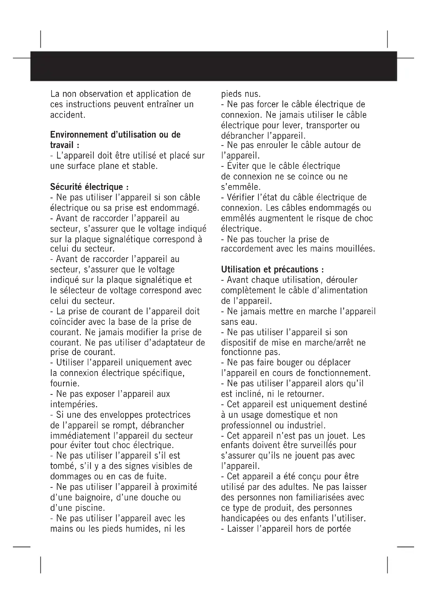 | Sécurité | Éteindre l'appareil lors du remplissage du réservoir |