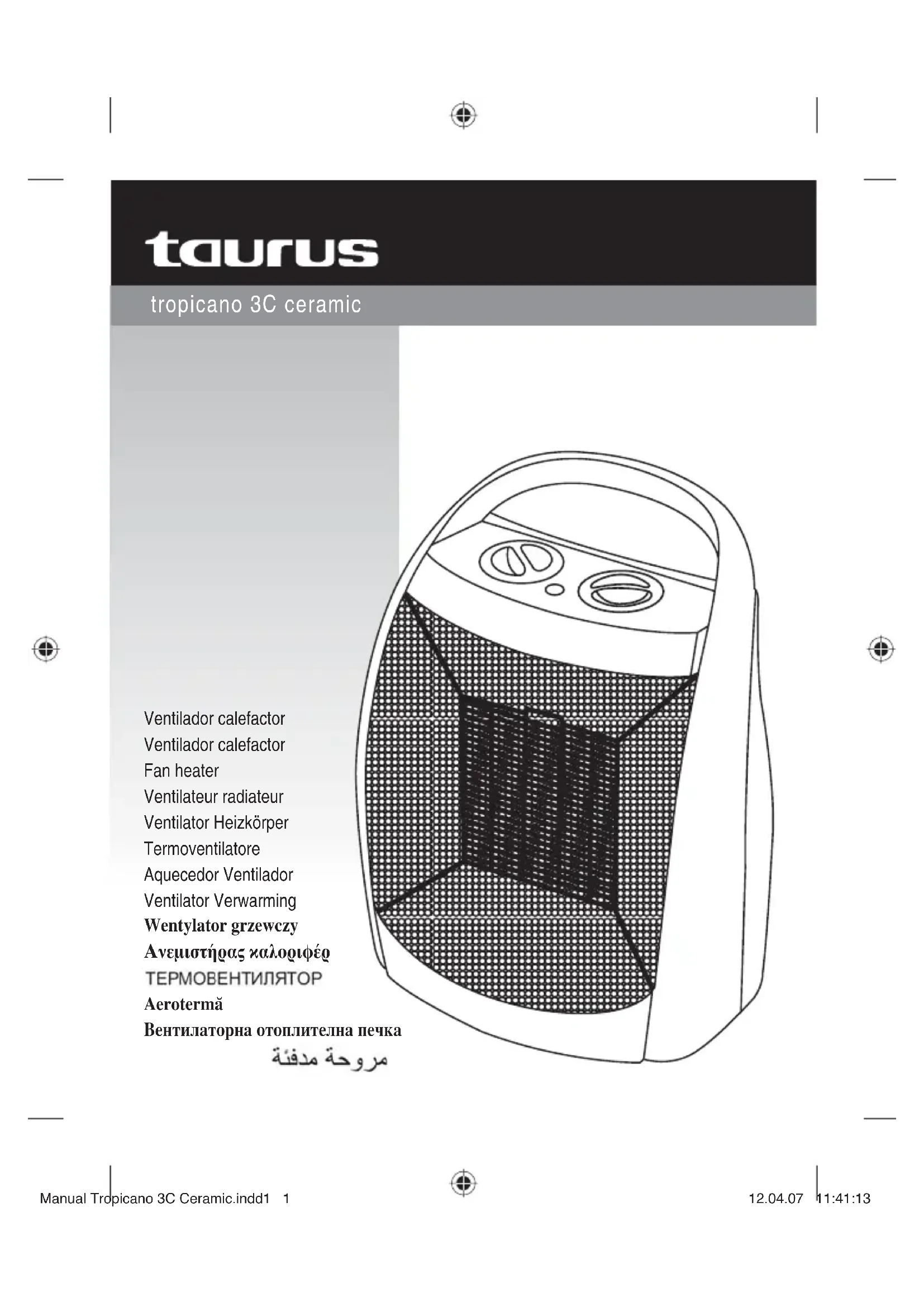 Cher client, Nous vous remercions d’avoir choisi d’acheter un produit de la marque TAURUS. Sa technologie, sa conception et sa fonctionnalité, ainsi que le fait qu’il réponde aux normes de qualité les plus strictes, vous garantissent une satisfaction à long terme. Description A Sélecteur de fonctions et de puissance B Thermostat C Indicateur lumineux D Poignée de transport Conseils et mesures de sécurité - Lire attentivement cette notice d’instructions avant de mettre l’appareil sous tension et la conserver pour toute consultation ultérieure. La non-observation et application de ces instructions peuvent entraîner un accident. Environnement d’utilisation ou de travail : - L’appareil ne doit pas être placé sous une prise électrique. - L’appareil doit être utilisé et placé sur une surface plane et stable. - Lors de la mise en place de l’appareil sur son support, assurez-vous que la surface sur laquelle sera le support est stable. Manual Tropicano 3C Ceramic.indd13 13Manual Tropicano 3C Ceramic.indd13 13 12.04.07 11:41:2912.04.07 11:41:29- Ne pas utiliser l’appareil en association avec un programmateur, une minuterie ou tout autre dispositif raccordé automatiquement à l’appareil car il existe un risque d’incendie si l’appareil est couvert ou mal installé. - AVERTISSEMENT : afin d’éviter une surchauffe, ne pas couvrir l’appareil. Sécurité électrique : - Ne pas utiliser l’appareil si son câble électrique ou sa prise est endommagé. - Avant de raccorder l’appareil au secteur, s’assurer que le voltage indiqué sur la plaque signalétique correspond à celui du secteur. - Brancher l’appareil à une prise de courant supportant au minimum 10 ampères. - La prise de courant de l’appareil doit coïncider avec la base de la prise de courant. Ne jamais modifier la prise de courant. Ne pas utiliser d’adaptateur de prise de courant. - Ne pas exposer l’appareil aux intempéries. - Ne pas utiliser l’appareil à proximité d’une baignoire, d’une douche ou d’une piscine. - Ne pas forcer le câble électrique. Ne jamais utiliser le câble électrique pour lever, transporter ou débrancher l’appareil. - Vérifier l’état du câble d’alimentation. Les câbles endommagés ou emmêlés augmentent le risque de choc électrique. - Ne pas toucher la prise de raccordement avec les mains mouillées. Utilisation et précautions : - Avant chaque utilisation, dérouler complètement le câble d’alimentation de l’appareil. - Ne pas utiliser l’appareil si son dispositif de mise en marche/arrêt ne fonctionne pas. - Débrancher l’appareil du secteur tant qu’il reste hors d’usage et avant de procéder à toute opération de nettoyage. - Cet appareil est uniquement destiné à un usage domestique et non professionnel ou industriel. - Cet appareil a été conçu pour être utilisé par des adultes. Ne pas laisser des personnes non familiarisées avec ce type de produit, des personnes handicapées ou des enfants l’utiliser. - Laisser l’appareil hors de portée des enfants et/ou des personnes handicapées. - Vérifier que les grilles de ventilation de l’appareil ne sont pas obstruées par de la poussière, de la saleté ou tout objet. - Placer le thermostat en position minimum (MIN) ne garantit pas la déconnexion permanente de l’appareil. - Toute utilisation inadéquate ou non conforme aux instructions d’utilisation comporte un risque, invalide la garantie et annule la responsabilité du fabricant. Mode d’emploi - Dérouler entièrement le câble avant de brancher. - Brancher l’appareil au secteur. - Mettre l’appareil en marche en actionnant le sélecteur de fonctions et puissances. - Tourner le thermostat jusqu’à ce qu’il se situe dans la position correspondant à la température désirée. Manual Tropicano 3C Ceramic.indd14 14Manual Tropicano 3C Ceramic.indd14 14 12.04.07 11:41:3012.04.07 11:41:30Fonction du ventilateur : - Sélectionner la position ventilateur. - Sélectionner la vitesse de ventilation désirée. - Vérifier que le thermostat est situé au maximum. Fonction du radiateur : - Sélectionner la position radiateur. - Sélectionner la puissance de chauffage désirée. - Vérifier que la commande du thermostat est situé à la température désirée. Lorsque vous avez fini de vous servir de l’appareil : - Sélectionner la position minimum (MIN) à l’aide du sélecteur de vitesse. - Arrêter l’appareil en sélectionnant la position 0 du sélecteur de puissance. - Débrancher l’appareil du secteur. Poignée de transport : - Cet appareil dispose d’une poignée située sur la partie supérieure afin de rendre son transport facile et pratique. Protection thermique de sécurité : - L’appareil contient un dispositif thermique de sécurité qui protège l’appareil de toute surchauffe. - Lorsque l’appareil se met en marche et s’arrête alternativement sans que cela soit dû au thermostat, vérifier qu’il n’y a aucun obstacle qui gène ou rend difficile l’entrée ou la sortie normale de l’air. - Si l’appareil se déconnecte tout seul et que vous ne parvenez pas à le reconnecter, débranchez-le et attendez environ 15 minutes avant de le rebrancher. S’il ne fonctionne toujours pas, faites appel à l’un des services d’assistance technique autorisés. Nettoyage - Débrancher l’appareil du secteur et le laisser refroidir avant de procéder à toute opération de nettoyage. - Nettoyer l’appareil en le frottant avec un chiffon humidifié imprégné de quelques gouttes de détergent puis le sécher. - Ne pas utiliser de solvants ni de produits à pH acide ou basique tels que l’eau de javel, ni de produits abrasifs pour nettoyer l’appareil. - Ne pas immerger l’appareil dans l’eau ou tout autre liquide, ni le passer sous un robinet. Anomalies et réparation - En cas de panne, remettre l’appareil à un service d’assistance technique autorisé. Ne pas tenter de procéder 
