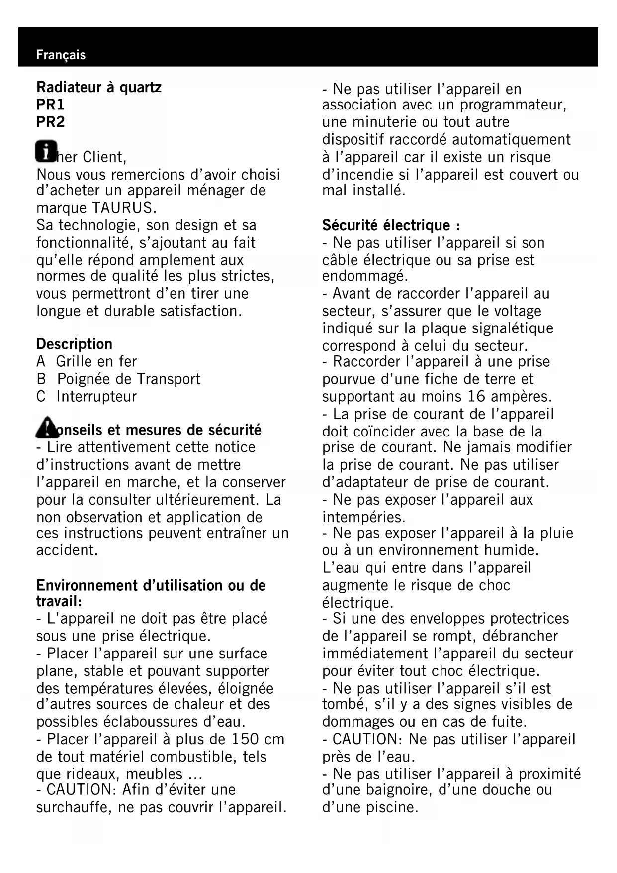 PR1 - Chauffage TAURUS - Notice d'utilisation et mode d'emploi gratuit