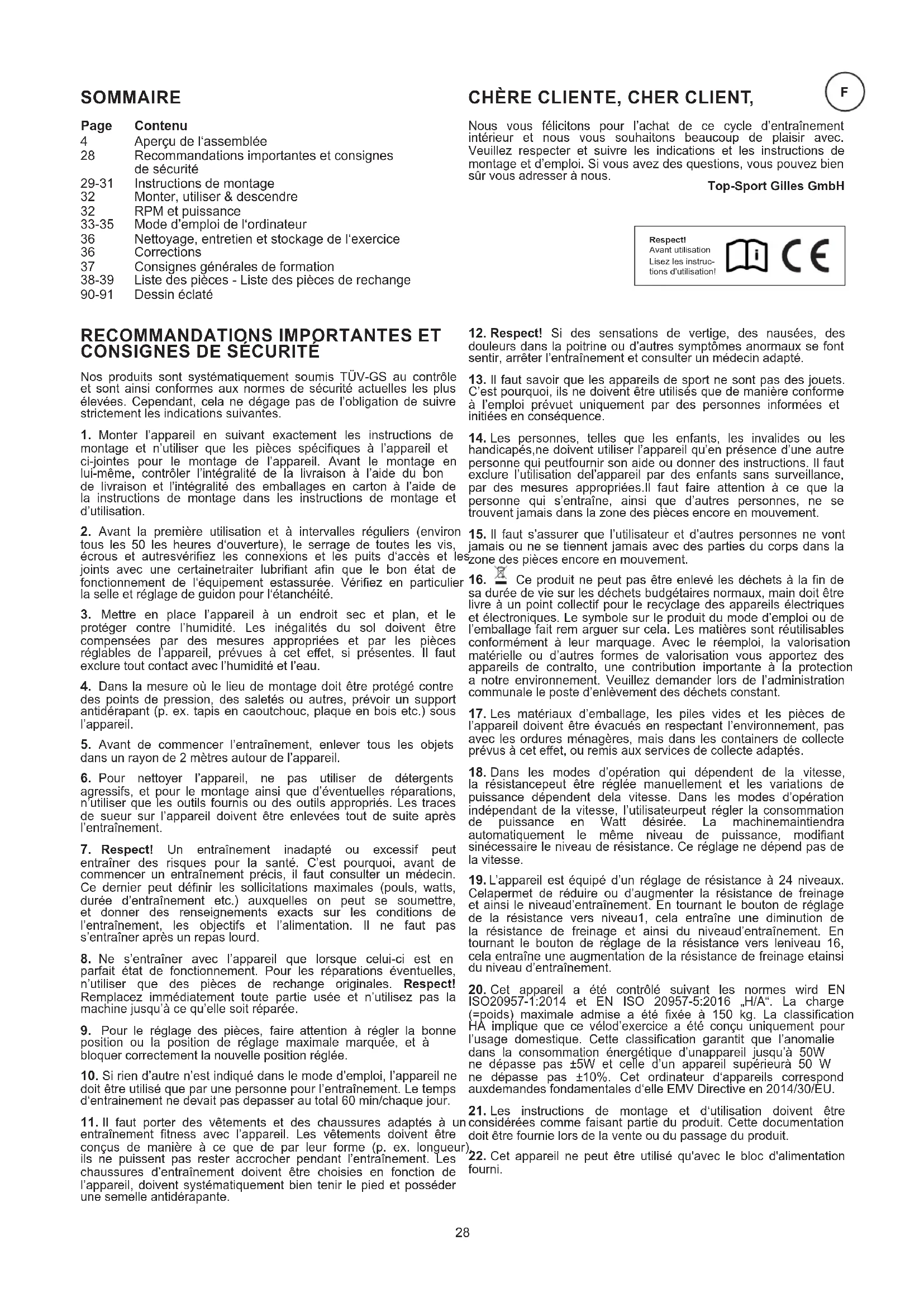 Nos produits sont systématiquement soumis TÜV-GS au contrôle et sont ainsi conformes aux normes de sécurité actuelles les plus élevées. Cependant, cela ne dégage pas de l’obligation de suivre strictement les indications suivantes. Top-Sport Gilles GmbH Aperçu de l‘assemblée Recommandations importantes et consignes de sécurité Instructions de montage Monter, utiliser & descendre RPM et puissance Mode d’emploi de l‘ordinateur Nettoyage, entretien et stockage de l‘exercice Corrections Consignes générales de formation Liste des pièces - Liste des pièces de rechange Dessin éclaté