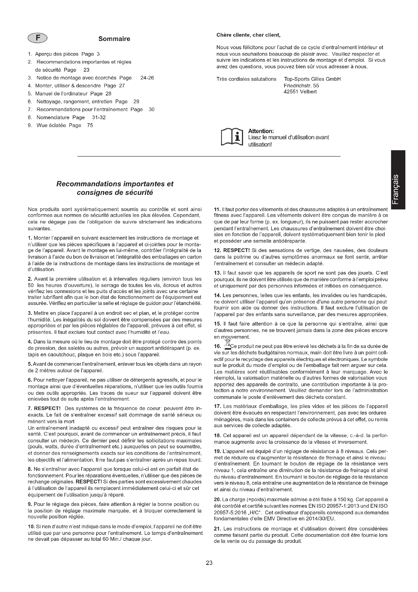 comme faisant partie du produit. Cette documentation doit être fournie lors de la vente ou du passage du produit. Chère cliente, cher client, Nous vous félicitons pour l’achat de ce cycle d’entraînement intérieur et nous vous souhaitons beaucoup de plaisir avec. Veuillez respecter et suivre les indications et les instructions de montage et d’emploi. Si vous avez des questions, vous pouvez bien sûr vous adresser à nous. Très cordiales salutations Top-Sports Gilles GmbH Friedrichstr. 55 42551 Velbert Français Attention: Lisez le manuel d‘utilisation avant utilisation!24 Instructions de montage Sortez toutes les pièces de l’emballage, posez-les sur le sol et contrôlez si rien ne manque en vous basant grossièrement sur la étapes de montage. Il faut tenir compte du fait que certaines pièces ont été reliées au cadre et prémontrés. Quelques autres pièces ont également déjà été jointes. Ceci an de faciliter et d’accélérer le montage dénitif. Temps de Montage: 30 - 40 min. Etape n° 1: Montage du pied avant et arrière (20+27)