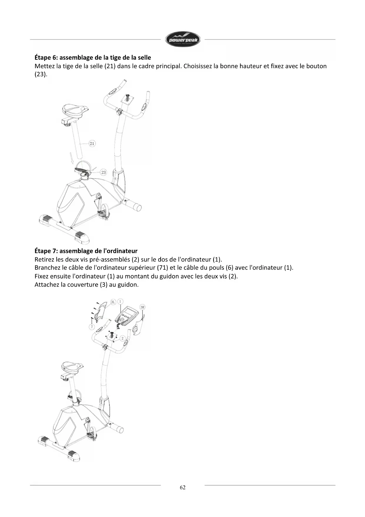 61Étape6:assemblagedelatigedelaselle Mettezlatigedelaselle(21)danslecadreprincipal.Choisissezlabonnehauteuretfixezaveclebouton (23).