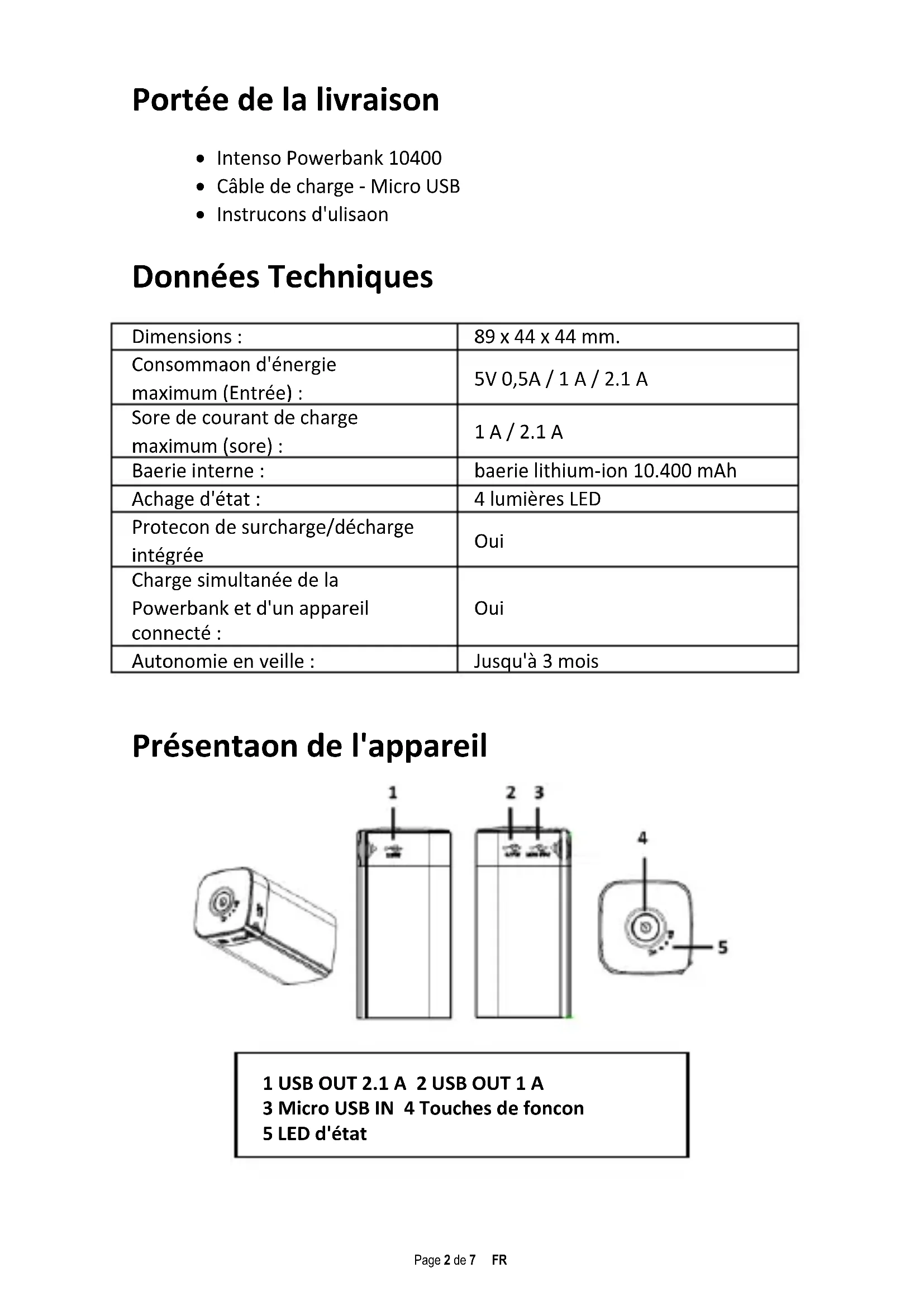 POWERBANK 10400Page 2 de 7 FR Portée de la livraison Intenso Powerbank 10400 Câble de charge - Micro USB Instructions d'utilisation Données Techniques Dimensions : 89 x 44 x 44 mm. Consommation d'énergie maximum (Entrée) : 5V 0,5A / 1 A / 2.1 A Sortie de courant de charge maximum (sortie) : 1 A / 2.1 A Batterie interne : batterie lithium-ion 10.400 mAh Affichage d'état : 4 lumières LED Protection de surcharge/décharge intégrée Oui Charge simultanée de la Powerbank et d'un appareil connecté : Oui Autonomie en veille : Jusqu'à 3 mois