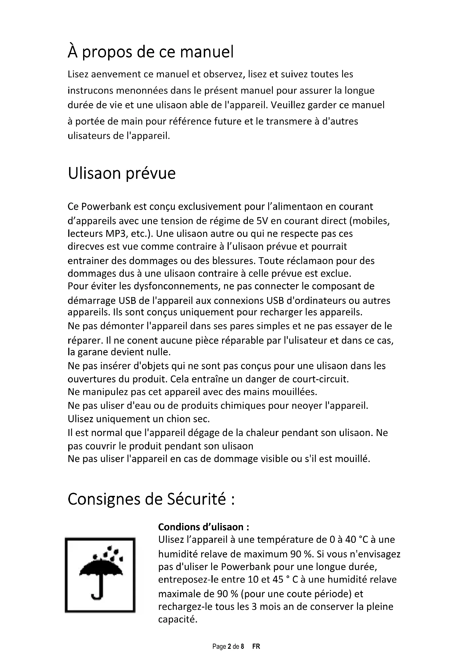 POWERBANK P2600Page 2 de 8 FR À propos de ce manuel Lisez attentivement ce manuel et observez, lisez et suivez toutes les instructions mentionnées dans le présent manuel pour assurer la longue durée de vie et une utilisation fiable de l'appareil. Veuillez garder ce manuel à portée de main pour référence future et le transmettre à d'autres utilisateurs de l'appareil. Utilisation prévue Ce Powerbank est conçu exclusivement pour l’alimentation en courant d’appareils avec une tension de régime de 5V en courant direct (mobiles, lecteurs MP3, etc.). Une utilisation autre ou qui ne respecte pas ces directives est vue comme contraire à l’utilisation prévue et pourrait entrainer des dommages ou des blessures. Toute réclamation pour des dommages dus à une utilisation contraire à celle prévue est exclue. Pour éviter les dysfonctionnements, ne pas connecter le composant de démarrage USB de l'appareil aux connexions USB d'ordinateurs ou autres appareils. Ils sont conçus uniquement pour recharger les appareils. Ne pas démonter l'appareil dans ses parties simples et ne pas essayer de le réparer. Il ne contient aucune pièce réparable par l'utilisateur et dans ce cas, la garantie devient nulle. Ne pas insérer d'objets qui ne sont pas conçus pour une utilisation dans les ouvertures du produit. Cela entraîne un danger de court-circuit. Ne manipulez pas cet appareil avec des mains mouillées. Ne pas utiliser d'eau ou de produits chimiques pour nettoyer l'appareil. Utilisez uniquement un chiffon sec. Il est normal que l'appareil dégage de la chaleur pendant son utilisation. Ne pas couvrir le produit pendant son utilisation Ne pas utiliser l'appareil en cas de dommage visible ou s'il est mouillé. Consignes de Sécurité : Conditions d’utilisation : Utilisez l’appareil à une température de 0 à 40 °C à une humidité relative de maximum 90 %. Si vous n'envisagez pas d'utiliser le Powerbank pour une longue durée, entreposez-le entre 10 et 45 ° C à une humidité relative maximale de 90 % (pour une coute période) et rechargez-le tous les 3 mois afin de conserver la pleine capacité.Page 3 de 8 FR Ne pas utiliser l'appareil dans des conditions extrêmement froides, chaudes, humides ou poussiéreuses. Ne pas exposer non-plus au rayonnement solaire direct. Evitez tout contact avec une flame. Risque d'explosion !
