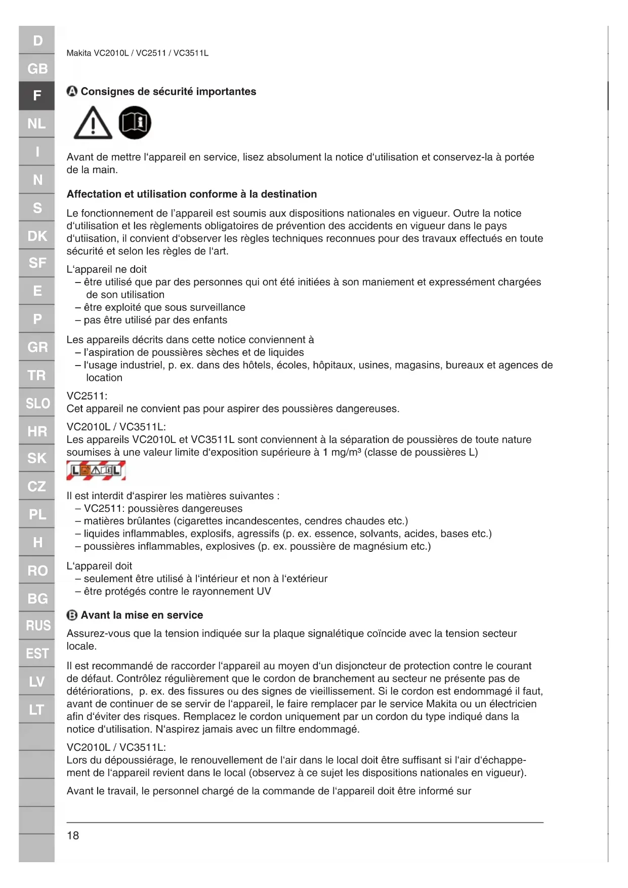 Makita VC2010L / VC2511 / VC3511L Consignes de sécurité importantes Avant de mettre l‘appareil en service, lisez absolument la notice d‘utilisation et conservez-la à portée de la main. Affectation et utilisation conforme à la destination Le fonctionnement de l’appareil est soumis aux dispositions nationales en vigueur. Outre la notice d‘utilisation et les règlements obligatoires de prévention des accidents en vigueur dans le pays d‘utiisation, il convient d‘observer les règles techniques reconnues pour des travaux effectués en toute sécurité et selon les règles de l‘art. L‘appareil ne doit – être utilisé que par des personnes qui ont été initiées à son maniement et expressément chargées de son utilisation – être exploité que sous surveillance – pas être utilisé par des enfants Les appareils décrits dans cette notice conviennent à – l’aspiration de poussières sèches et de liquides – l‘usage industriel, p. ex. dans des hôtels, écoles, hôpitaux, usines, magasins, bureaux et agences de location VC2511: Cet appareil ne convient pas pour aspirer des poussières dangereuses. VC2010L / VC3511L: Les appareils VC2010L et VC3511L sont conviennent à la séparation de poussières de toute nature soumises à une valeur limite d‘exposition supérieure à 1 mg/m³ (classe de poussières L) Il est interdit d‘aspirer les matières suivantes : – VC2511: poussières dangereuses – matières brûlantes (cigarettes incandescentes, cendres chaudes etc.) – liquides inflammables, explosifs, agressifs (p. ex. essence, solvants, acides, bases etc.) – poussières inflammables, explosives (p. ex. poussière de magnésium etc.) L‘appareil doit – seulement être utilisé à l‘intérieur et non à l‘extérieur – être protégés contre le rayonnement UV Avant la mise en service Assurez-vous que la tension indiquée sur la plaque signalétique coïncide avec la tension secteur locale. Il est recommandé de raccorder l‘appareil au moyen d‘un disjoncteur de protection contre le courant de défaut. Contrôlez régulièrement que le cordon de branchement au secteur ne présente pas de détériorations, p. ex. des fissures ou des signes de vieillissement. Si le cordon est endommagé il faut, avant de continuer de se servir de l‘appareil, le faire remplacer par le service Makita ou un électricien afin d‘éviter des risques. Remplacez le cordon uniquement par un cordon du type indiqué dans la notice d‘utilisation. N‘aspirez jamais avec un filtre endommagé. VC2010L / VC3511L: Lors du dépoussiérage, le renouvellement de l‘air dans le local doit être suffisant si l‘air d‘échappe- ment de l‘appareil revient dans le local (observez à ce sujet les dispositions nationales en vigueur). Avant le travail, le personnel chargé de la commande de l‘appareil doit être informé surD