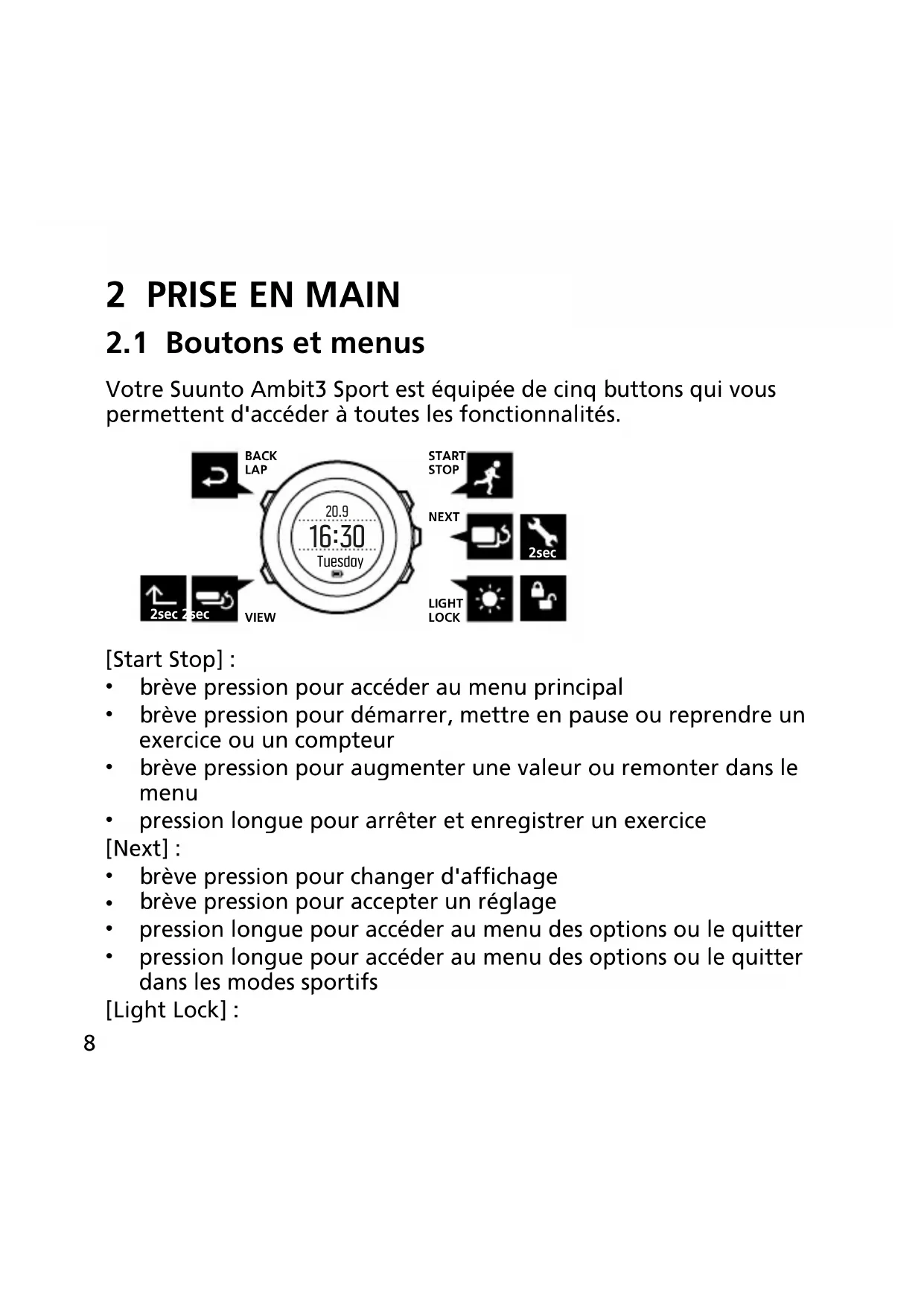 Votre Suunto Ambit3 Sport est équipée de cinq buttons qui vous permettent d'accéder à toutes les fonctionnalités. BACK LAP START STOP NEXT LIGHT LOCK VIEW 2sec 2sec 2sec Tuesday