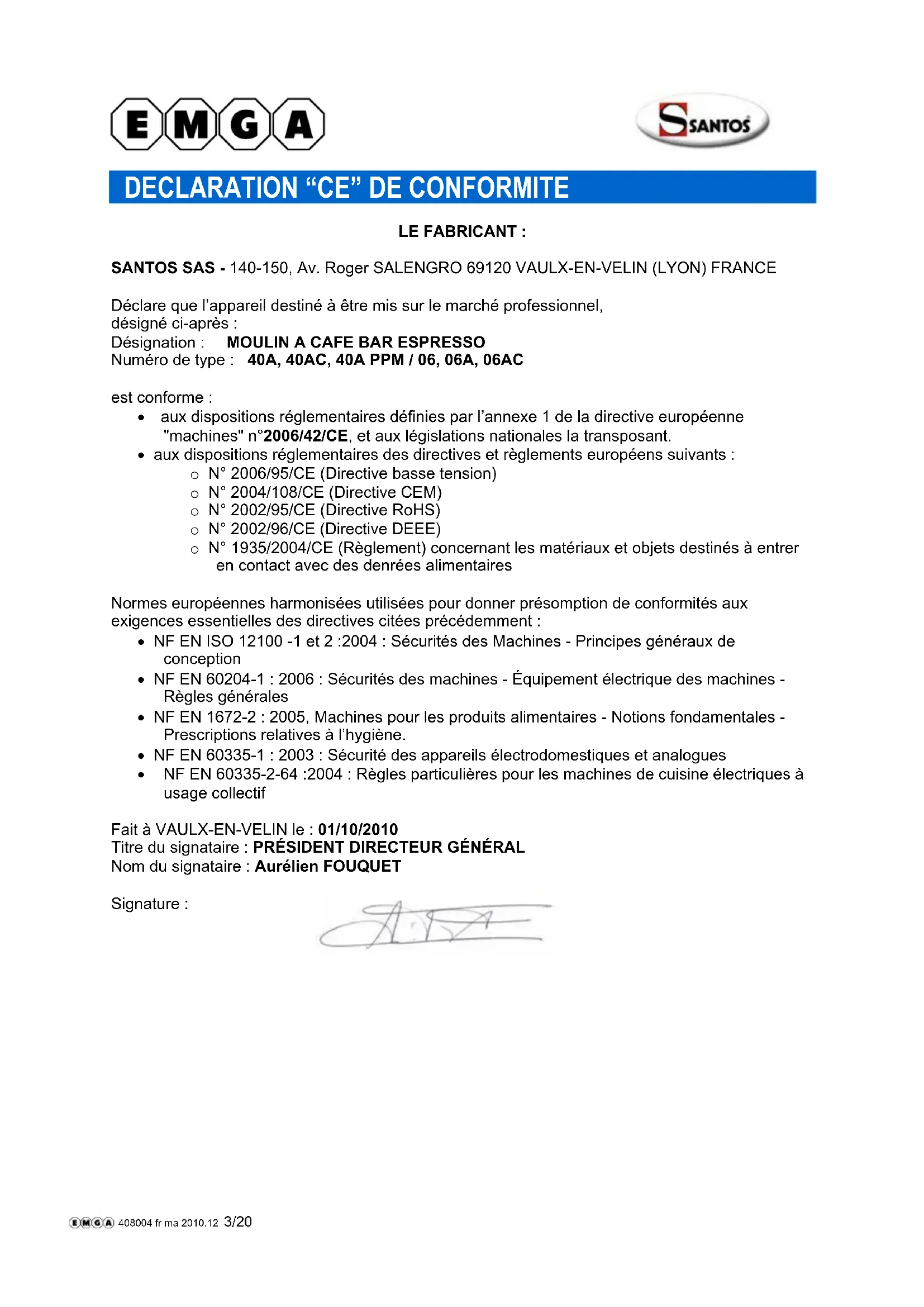 LE FABRICANT : SANTOS SAS - 140-150, Av. Roger SALENGRO 69120 VAULX-EN-VELIN (LYON) FRANCE Déclare que l’appareil destiné à être mis sur le marché professionnel, désigné ci-après : Désignation : MOULIN A CAFE BAR ESPRESSO Numéro de type : 40A, 40AC, 40A PPM / 06, 06A, 06AC est conforme : aux dispositions réglementaires définies par l’annexe 1 de la directive européenne "machines" n°2006/42/CE, et aux législations nationales la transposant. aux dispositions réglementaires des directives et règlements européens suivants : o N° 2006/95/CE (Directive basse tension) o N° 2004/108/CE (Directive CEM) o N° 2002/95/CE (Directive RoHS) o N° 2002/96/CE (Directive DEEE) o N° 1935/2004/CE (Règlement) concernant les matériaux et objets destinés à entrer en contact avec des denrées alimentaires Normes européennes harmonisées utilisées pour donner présomption de conformités aux exigences essentielles des directives citées précédemment : NF EN ISO 12100 -1 et 2 :2004 : Sécurités des Machines - Principes généraux de conception NF EN 60204-1 : 2006 : Sécurités des machines - Équipement électrique des machines - Règles générales NF EN 1672-2 : 2005, Machines pour les produits alimentaires - Notions fondamentales - Prescriptions relatives à l’hygiène. NF EN 60335-1 : 2003 : Sécurité des appareils électrodomestiques et analogues NF EN 60335-2-64 :2004 : Règles particulières pour les machines de cuisine électriques à usage collectif Fait à VAULX-EN-VELIN le : 01/10/2010 Titre du signataire : PRÉSIDENT DIRECTEUR GÉNÉRAL Nom du signataire : Aurélien FOUQUET Signature : 408004 fr ma 2010.12 3/2098140 FR 3.4 - 12 2010 4 / 20 www.santos.fr
