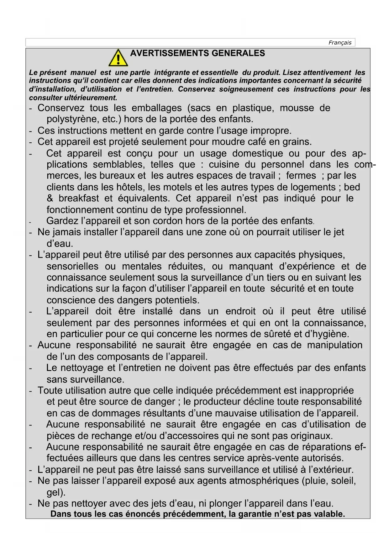 IEC 60335-1:2012 + AC:2014 + A11:2014 + A13:2017 + A1:2019 + A14:2019 + A2:2019 + A15:2021 EN 62233:2008 + AC:2008 EN 55014-1:2017; EN 55014-2:2015; EN 61000-3-2:2019; EN 61000-3-3:2013+A1:2019 NB: Die vorliegende Erklärung verliert unmittelbar seine Gültigkeit, wenn das Produkt ohne unsere ausdrückliche Zustimmung verändert oder spezifiziert wirdFrançais AVERTISSEMENTS GENERALES Le présent manuel est une partie intégrante et essentielle du produit. Lisez attentivement les instructions qu’il contient car elles donnent des indications importantes concernant la sécurité d’installation, d’utilisation et l’entretien. Conservez soigneusement ces instructions pour les consulter ultérieurement. - Conservez tous les emballages (sacs en plastique, mousse de polystyrène, etc.) hors de la portée des enfants. - Ces instructions mettent en garde contre l’usage impropre. - Cet appareil est projeté seulement pour moudre café en grains. - Cet appareil est conçu pour un usage domestique ou pour des ap- plications semblables, telles que : cuisine du personnel dans les com- merces, les bureaux et les autres espaces de travail ; fermes ; par les clients dans les hôtels, les motels et les autres types de logements ; bed & breakfast et équivalents. Cet appareil n’est pas indiqué pour le fonctionnement continu de type professionnel. - Gardez l’appareil et son cordon hors de la portée des enfants. - Ne jamais installer l’appareil dans une zone où on pourrait utiliser le jet d’eau. - L’appareil peut être utilisé par des personnes aux capacités physiques, sensorielles ou mentales réduites, ou manquant d’expérience et de connaissance seulement sous la surveillance d’un tiers ou en suivant les indications sur la façon d’utiliser l’appareil en toute sécurité et en toute conscience des dangers potentiels. - L’appareil doit être installé dans un endroit où il peut être utilisé seulement par des personnes informées et qui en ont la connaissance, en particulier pour ce qui concerne les normes de sûreté et d’hygiène. - Aucune responsabilité ne saurait être engagée en cas de manipulation de l’un des composants de l’appareil. - Le nettoyage et l’entretien ne doivent pas être effectués par des enfants sans surveillance. - Toute utilisation autre que celle indiquée précédemment est inappropriée et peut être source de danger ; le producteur décline toute responsabilité en cas de dommages résultants d’une mauvaise utilisation de l’appareil. - Aucune responsabilité ne saurait être engagée en cas d’utilisation de pièces de rechange et/ou d’accessoires qui ne sont pas originaux. - Aucune responsabilité ne saurait être engagée en cas de réparations ef- fectuées ailleurs que dans les centres service après-vente autorisés. - L’appareil ne peut pas être laissé sans surveillance et utilisé à l’extérieur. - Ne pas laisser l’appareil exposé aux agents atmosphériques (pluie, soleil, gel). - Ne pas nettoyer avec des jets d’eau, ni plonger l’appareil dans l’eau. Dans tous les cas énoncés précédem ment, la garantie n’est pas v