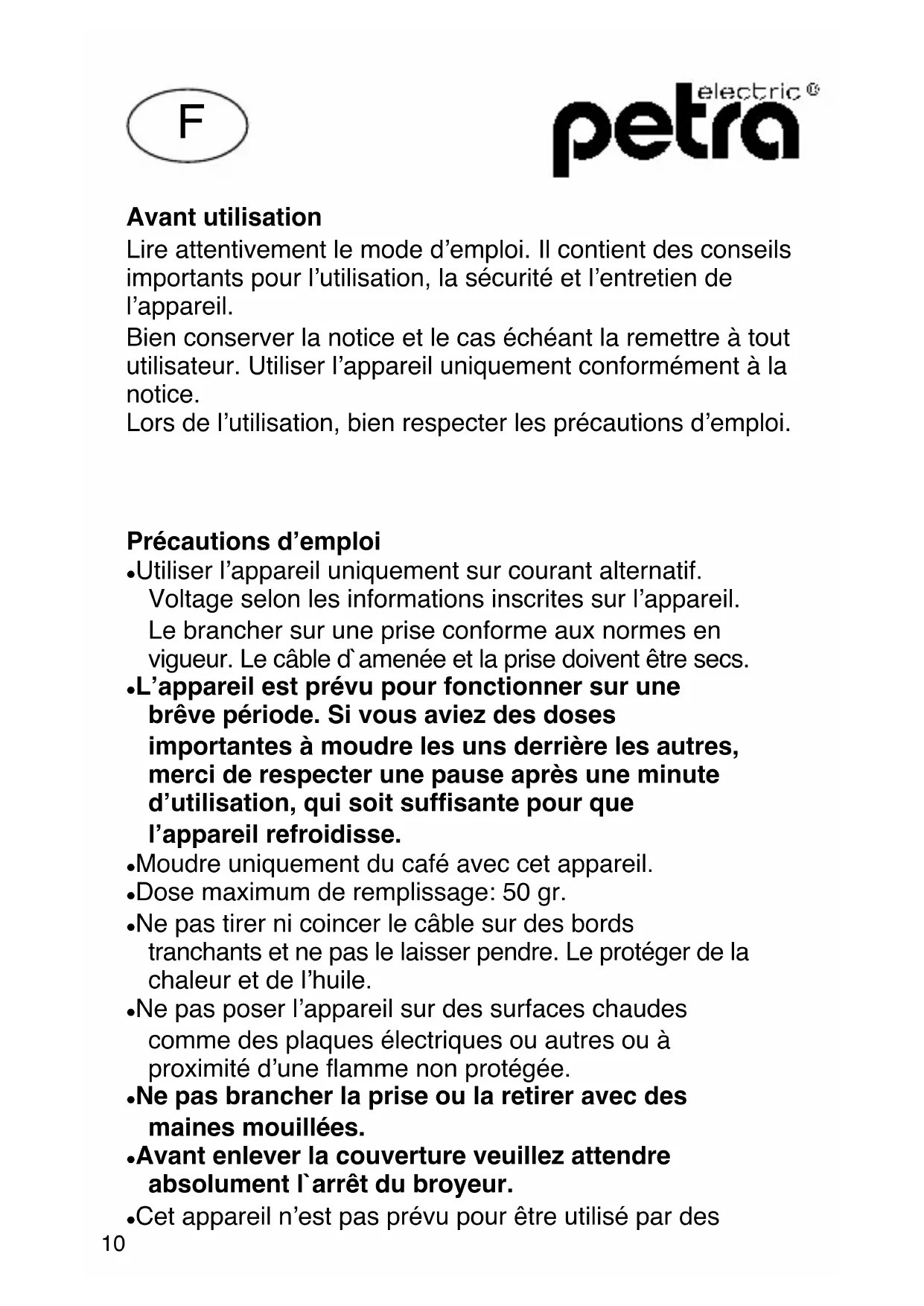9Avant utilisation Lire attentivement le mode d’emploi. Il contient des conseils importants pour l’utilisation, la sécurité et l’entretien de l’appareil. Bien conserver la notice et le cas échéant la remettre à tout utilisateur. Utiliser l’appareil uniquement conformément à la notice. Lors de l’utilisation, bien respecter les précautions d’emploi. Précautions d’emploi Utiliser l’appareil uniquement sur courant alternatif. Voltage selon les informations inscrites sur l’appareil. Le brancher sur une prise conforme aux normes en vigueur. Le câble d`amenée et la prise doivent être secs. L’appareil est prévu pour fonctionner sur une brêve période. Si vous aviez des doses importantes à moudre les uns derrière les autres, merci de respecter une pause après une minute d’utilisation, qui soit suffisante pour que l’appareil refroidisse. Moudre uniquement du café avec cet appareil. Dose maximum de remplissage: 50 gr. Ne pas tirer ni coincer le câble sur des bords tranchants et ne pas le laisser pendre. Le protéger de la chaleur et de l’huile. Ne pas poser l’appareil sur des surfaces chaudes comme des plaques électriques ou autres ou à proximité d’une flamme non protégée. Ne pas brancher la prise ou la retirer avec des maines mouillées. Avant enlever la couverture veuillez attendre absolument l`arrêt du broyeur. Cet appareil n’est pas prévu pour être utilisé par des