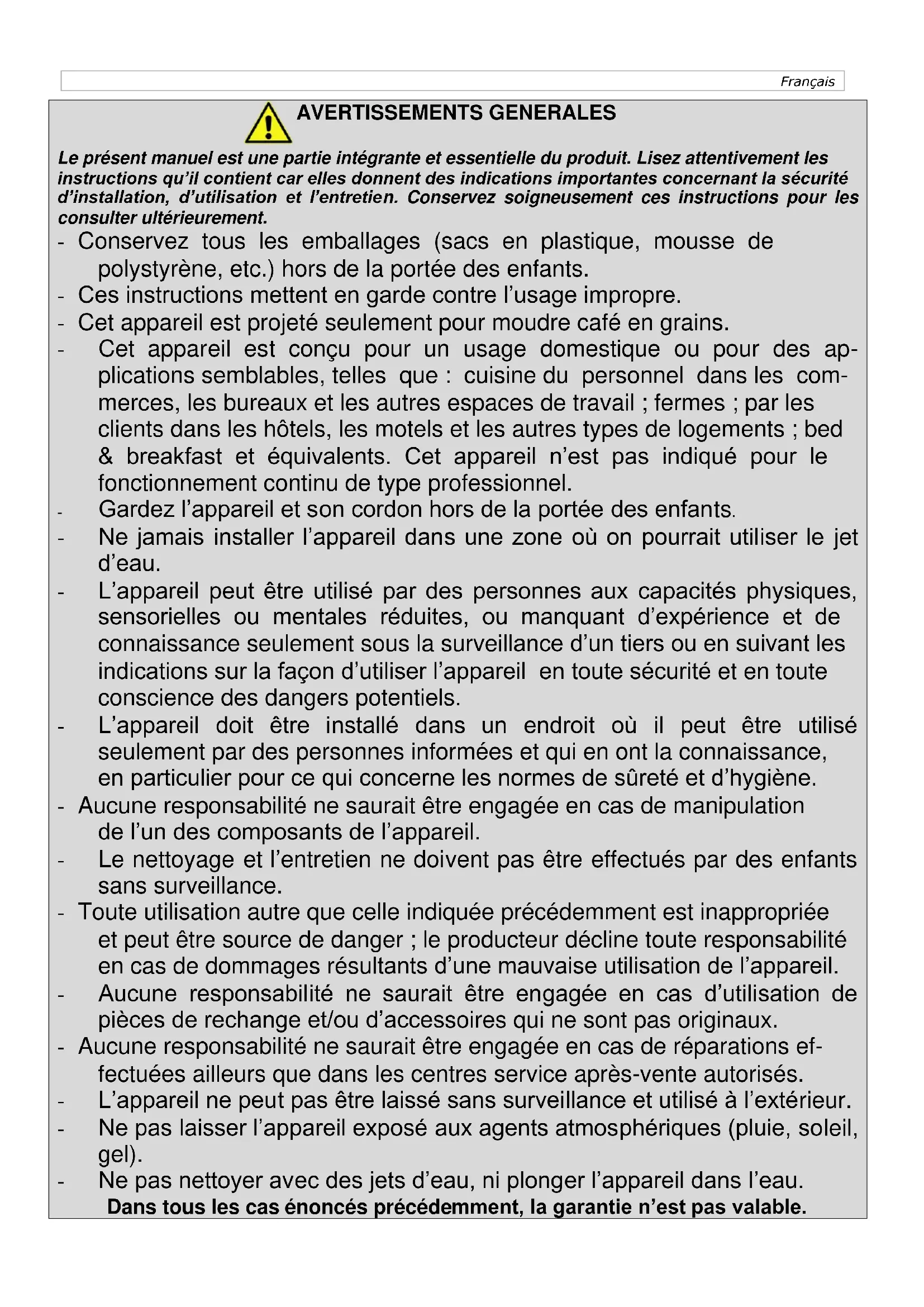 CARACTERISTIQUES TECHNIQUES : Tension : 220/230 V 50/60 Hz Puissance : 150 W Poids : 3 kg ; Capacité : 250 gr Durée fonctionnement continu : 20 sec ON – 60 sec OFFFrançais COMPOSANTS: