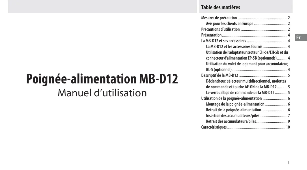 Avis pour les clients en Europe 2 Précautions d’utilisation 2 Présentation 4 La MB-D12 et ses accessoires 4 La MB-D12 et les accessoires fournis 4 Utilisation de l’adaptateur secteur EH-5a/EH-5b et du connecteur d’alimentation EP-5B (optionnels) 4 Utilisation du volet de logement pour accumulateur, BL-5 (optionnel) 4 Descriptif de la MB-D12 5 Déclencheur, sélecteur multidirectionnel, molettes de commande et touche AF-ON de la MB-D12 5 Le verrouillage de commande de la MB-D12 5 Utilisation de la poignée-alimentation 6 Montage de la poignée-alimentation 6 Retrait de la poignée-alimentation 6 Insertion des accumulateurs/piles7 Retrait des accumulateurs/piles 9 Caractéristiques 10