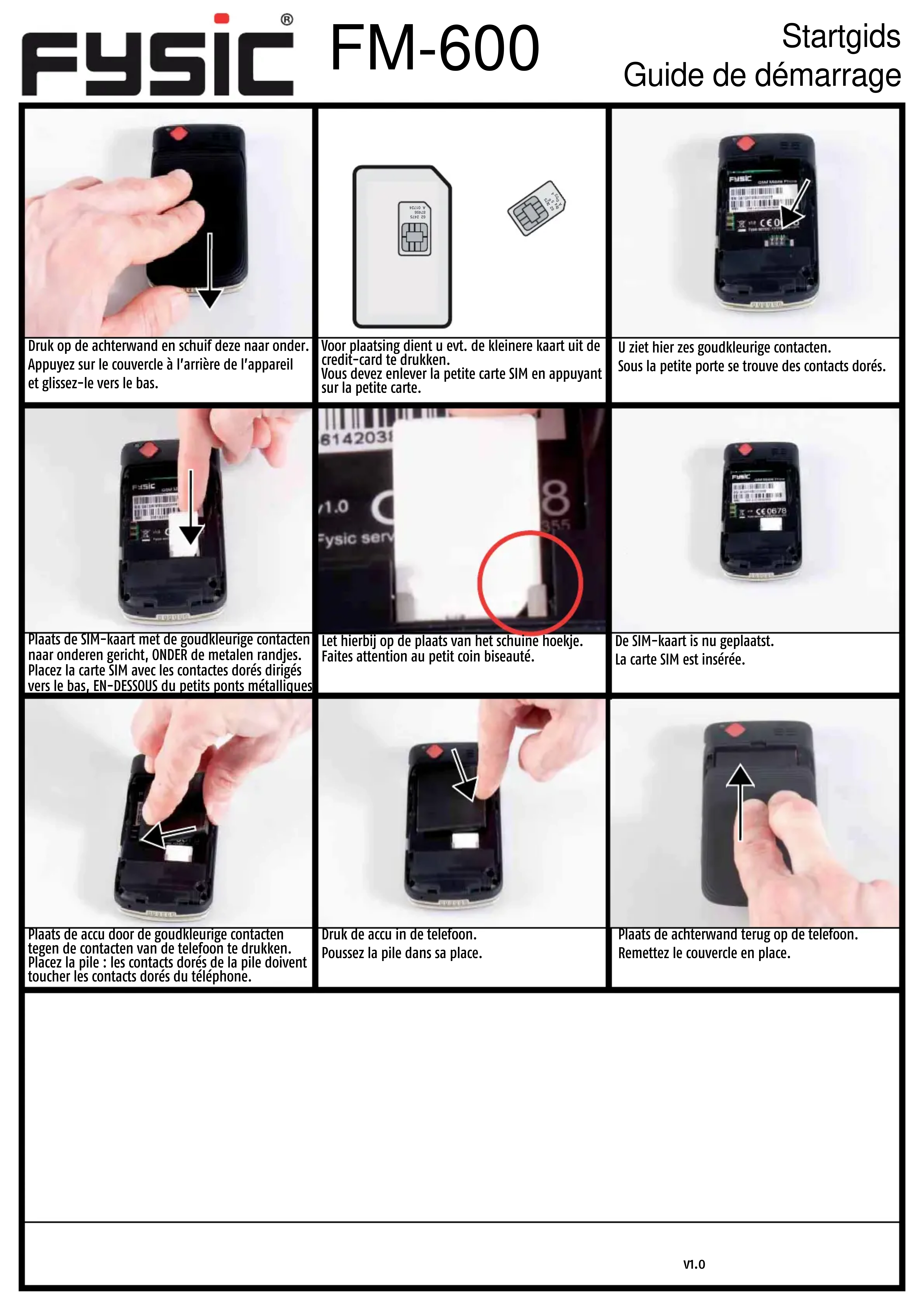 | Druk op de hinterwand en schuif dezearpaand. Appuyez sur le couvercle à l'arrête de l'appareil et glissez-le vers le bas. | Voor plaatsing dient uevt. de Kleinere kaart uit de credit-card te drukken. Vousdezenvlemer la petite carte SIM en appuyant sur la petite carte. | U ziet hier zes goudkleurige contacten. Sous la petite porte se trouve des contacts dorés. |