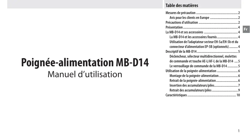 Avis pour les clients en Europe 2 Précautions d’utilisation 2 Présentation 4 Fr La MB-D14 et ses accessoires 4 La MB-D14 et les accessoires fournis 4 Utilisation de l’adaptateur secteur EH-5a/EH-5b et du connecteur d’alimentation EP-5B (optionnels) 4 Descriptif de la MB-D14 5 Déclencheur, sélecteur multidirectionnel, molettes de commande et touche AE-L/AF-L de la MB-D14 ....5 Le verrouillage de commande de la MB-D14 5 Utilisation de la poignée-alimentation 6 Montage de la poignée-alimentation 6 Retrait de la poignée-alimentation 6 Insertion des accumulateurs/piles7 Retrait des accumulateurs/piles 9 Caractéristiques 10