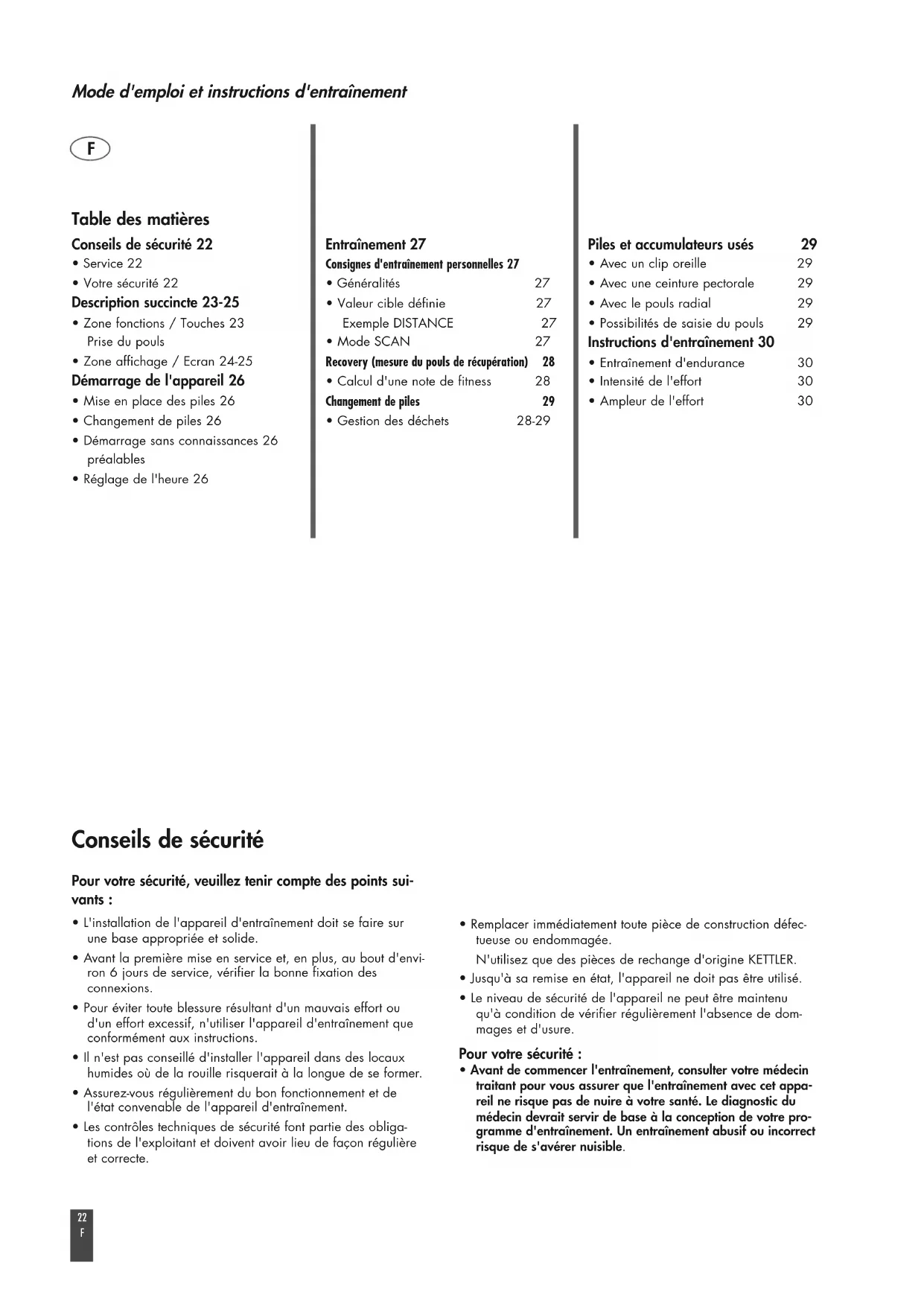 - Possibilités de saisie du pouls 29 Instructions d'entraînement 30