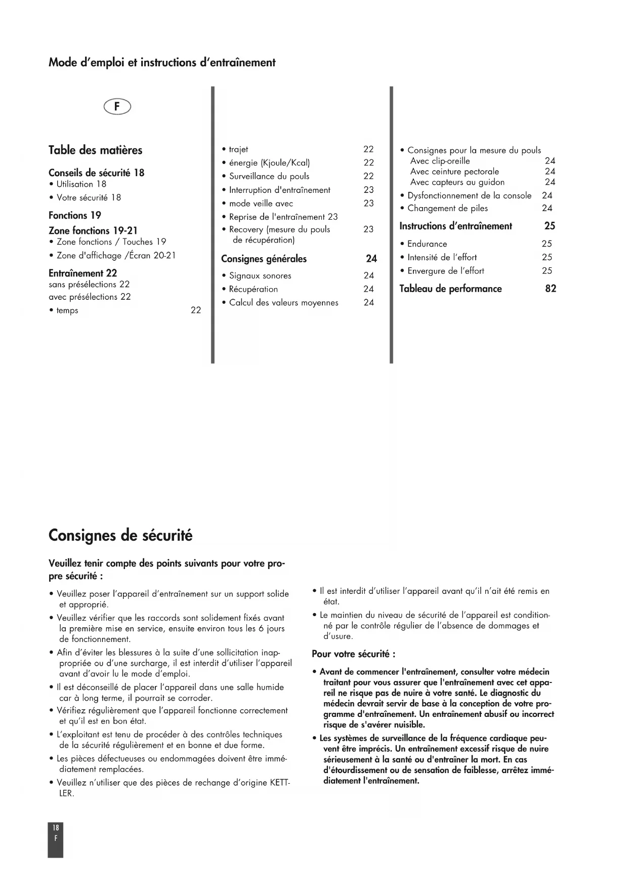- Les systèmes de surveillance de la fréquence cardiaque peu- vent être imprécis. Un entraînement excessif risque de nuire sérieusement à la santé ou d'entraîner la mort. En cas d'étourdissement ou de sensation de faiblesse, arrêtez immé- diatement l'entraînement. Table des matières Conseils de sécurité 18