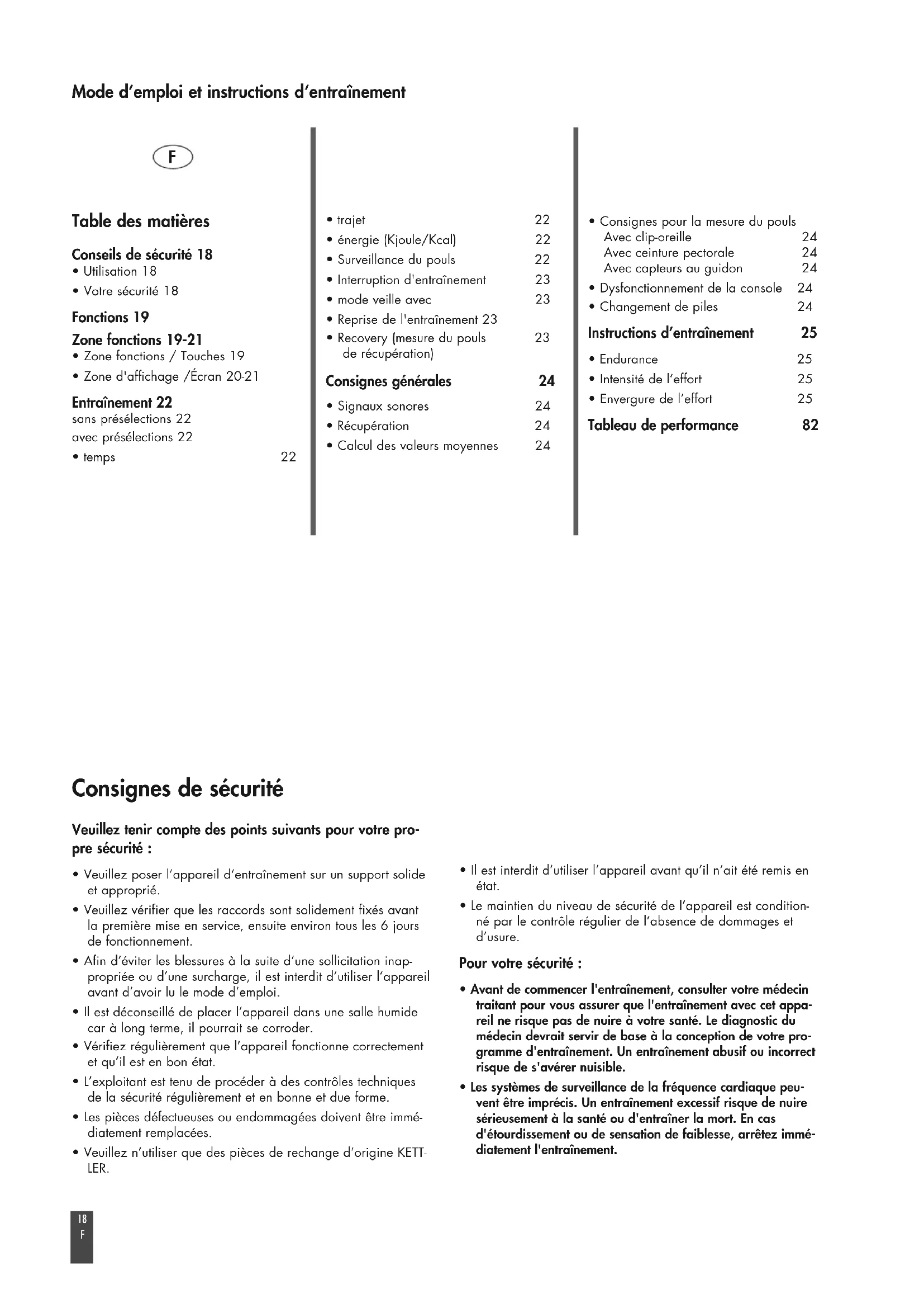 - Les systèmes de surveillance de la fréquence cardiaque peu- vent être imprécis. Un entraînement excessif risque de nuire sérieusement à la santé ou d'entraîner la mort. En cas d'étourdissement ou de sensation de faiblesse, arrêtez immé- diatement l'entraînement. Table des matières Conseils de sécurité 18