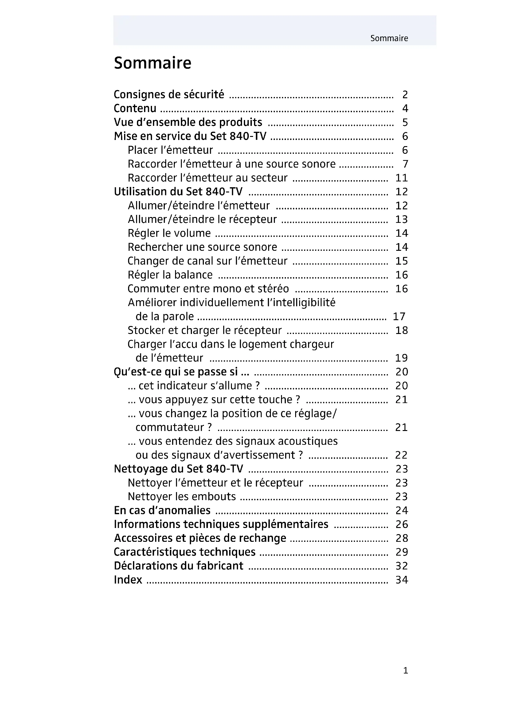 - Consulter un revendeur ou un technicien de radio ou télévision expérimenté. Ces appareils numériques de la classe B sont conformes à la norme NMB-003 du Canada. Toute modification non expressément approuvée par Senn- heiser electronic Corp. peut annuler le droit de l’utilisateur à l’emploi de l’équipement en question. Avant d’utiliser ces appareils, veuillez observer les disposi- tions légales en vigueur dans votre pays !34 Index Index Accu Charge 19 Emetteur Allumage/extinction 12 Amélioration de l’intelligibilité de la parole 17 Changement de canal 15 Commandes 5 Commutation entre mono et stéréo 16 Dépannage 24 Installation 6 Nettoyage 23 Raccordement à une source sonore 7 Raccordement au secteur 11 Raccordement via une prise casque 8 Raccordement via une prise péritel 9 Raccordement via une prise RCA 8 Utilisation du microphone externe MKE 800 TV-N 9 Fonctions spéciales Commande d’accentuation des aigus 27 Réglage fin de l’intelligibilité de la parole 26 Récepteur Allumage/extinction 13 Allumer le récepteur 13 Autonomie 18 Commandes 5 Eteindre le récepteur 13 Extinction des signaux acoustiques 22 Nettoyage 23 Placer le récepteur sur les oreilles 13 Réception perturbée 15 Recherche automatique de canal 14 Recherche de la source sonore 14 Réglage de la balance 16 Réglage du volume 14 Son est inaudible 24 Son est peu intelligible 25 Stockage et charge 18 Termes Compression/accentuation des aigus 26 Mono/stéréo 16 Versions Version EU 4 Version US 4Sennheiser electronic GmbH & Co. KG Am Labor 1, 30900 Wedemark, Germany Publ. 03/16 www.sennheiser.com 528279/A04