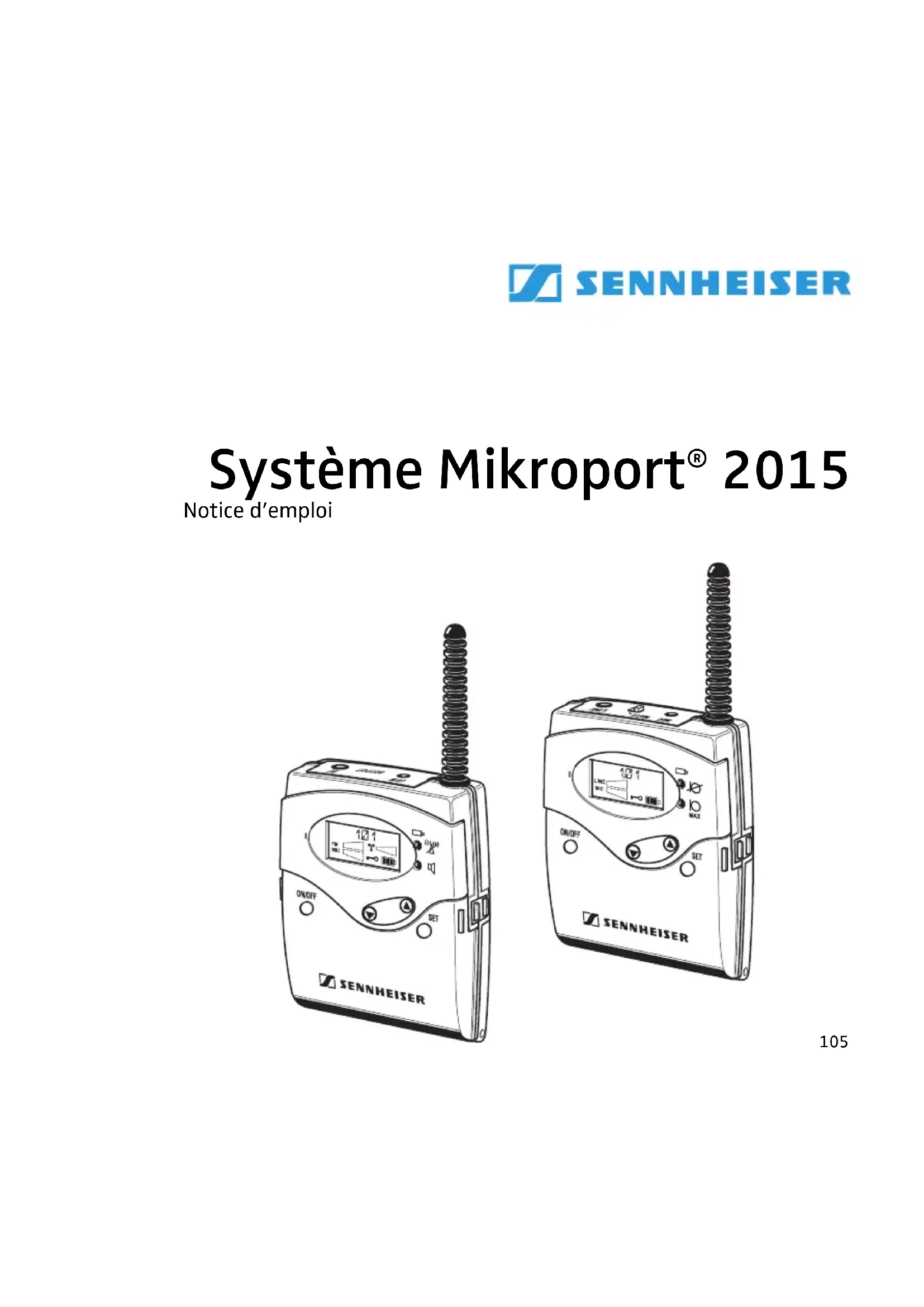 - Dèclaration de conformité , 317109 Le système Mikroport® 2015 Le système Mikroport® 2015 permet l’intégration de personnes souffrant de problèmes auditifs dans les écoles et les universités, au travail et pendant les loisirs. La conception et les charactéristiques de ce sys- tème sont adaptées de la meilleure façon possible aux exigences posées par ce groupe d’utilisateurs. La manipulation est d’un apprentissage aisé. En outre, les appareils sont de petite taille, légers et discrets. Principe de fonctionnement du système Mikroport® 2015 L’orateur, l’enseignant par exemple, porte l’émetteur SK 2015. Le malentendant, l’élève par exemple, porte le récepteur EK 2015. Un casque ou un câble de connexion pour l’appareil de correction auditive peuvent être branchés sur le récepteur. Sans fil, l’élève est en mesure d’entendre son professeur tout en restant entièrement libre de ses mouvements, comme s’il était assis à côté de ce dernier. Lorsque l’enseignant parle, les bruits ambiants se trouvent sensiblement réduits, à tel point que le dialogue entre l’enseignant et l’élève reste toujours prioritaire. Lorsque l’enseignant ne parle pas, l’élève entend ses camarades de classe soit par les microphones de l’appareil de correction auditive soit par le microphone incorporé du récepteur. Le sys- tème Mikroport® 2015 constitue un auxiliaire fiable même dans des conditions d’utilisation difficiles. La puissance d’émission est suffisante pour couvrir des distances relativement importantes. Le microphone cravate MKE 2015-2 garantit une bonne intelligibilité et offre la possibilité de lire des lèvres simultanément. La meilleure intelligibilité est garantite pas le microphone serre-tête ME 2015-H (accessoire en option) qui est directement positionné devant la bouche et qui compense les bruits parasites et une mauvaise acous- tique. La diversité des accessoires permet de raccorder le récepteur à pratiquement tout appareil de correc- tion auditive, la liaison pouvant être électrique ou inductive. L’alimentation électrique de l’émetteur et du récepteur est assurée par le pack accu BA 2015. Le pack accu BA 2015 fournit une puissance suffisante pour une journée (jusqu’à 12 heures). Les contacts de recharge sur l’émetteur et sur le récepteur permettent de recharger les appareils dans le chargeur L 2015 sans que le pack accu doit être retiré. Si aucun réseau électrique n’est disponible pour recharger le pack accu, vous pouvez aussi utiliser des piles rondes AA (1,5 V). En utilisant des piles, les émetteurs et récepteurs ont aussi une durée de fonctionnement de 12 heures. Il est en plus possible de connecter à la fiche jack 3,5 mm de l’émetteur des sources audio (p.ex. des lecteurs laser, des téléviseurs, la carte son de votre ordinateur etc.). Pour des écoles intégratives en particulier, il est un avantage que vous pouvez lier le système Mikroport® 2015 au système Soundfield EMP 2015. Au-delà, vous pouvez utiliser les émetteurs et les récepteurs de la série evolution wireless en combinaison avec le système Mikroport® 2015. Pour des informations plus précises voir “www.sennheiser.com”.110 Fournitures Contenu du système Mikroport® 2015: p. 316