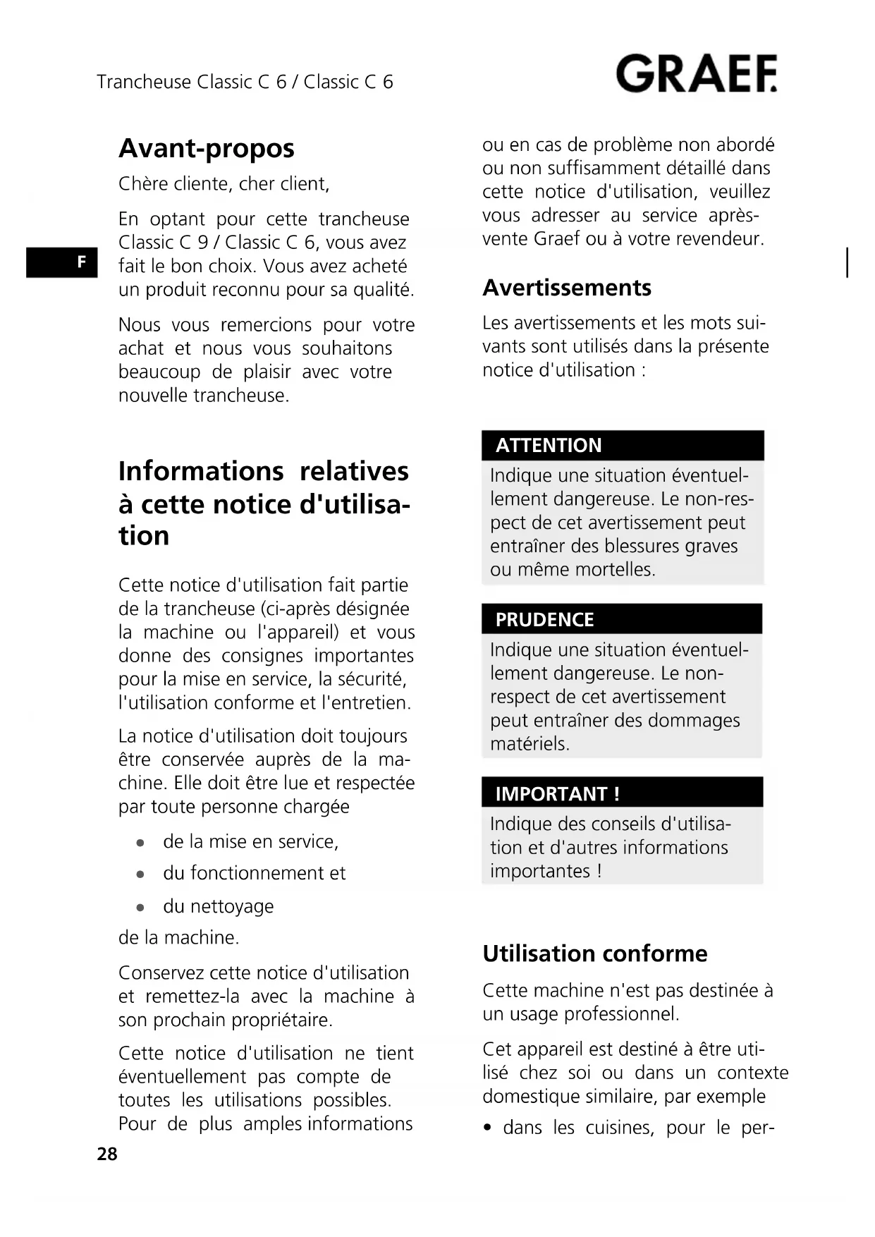 Avant-propos Chère cliente, cher client, En optant pour cette trancheuse Classic C 9 / Classic C 6, vous avez fait le bon choix. Vous avez acheté un produit reconnu pour sa qualité. Nous vous remercions pour votre achat et nous vous souhaitons beaucoup de plaisir avec votre nouvelle trancheuse. Informations relatives à cette notice d'utilisa- tion Cette notice d'utilisation fait partie de la trancheuse (ci-après désignée la machine ou l'appareil) et vous donne des consignes importantes pour la mise en service, la sécurité, l'utilisation conforme et l'entretien. La notice d'utilisation doit toujours être conservée auprès de la ma- chine. Elle doit être lue et respectée par toute personne chargée ● de la mise en service, ● du fonctionnement et ● du nettoyage de la machine. Conservez cette notice d'utilisation et remettez-la avec la machine à son prochain propriétaire. Cette notice d'utilisation ne tient éventuellement pas compte de toutes les utilisations possibles. Pour de plus amples informations ou en cas de problème non abordé ou non sufsamment détaillé dans cette notice d'utilisation, veuillez vous adresser au service après- vente Graef ou à votre revendeur. Avertissements Les avertissements et les mots sui- vants sont utilisés dans la présente notice d'utilisation : ATTENTION Indique une situation éventuel- lement dangereuse. Le non-res- pect de cet avertissement peut entraîner des blessures graves ou même mortelles. PRUDENCE Indique une situation éventuel- lement dangereuse. Le non- respect de cet avertissement peut entraîner des dommages matériels. IMPORTANT ! Indique des conseils d'utilisa- tion et d'autres informations importantes ! Utilisation conforme Cette machine n'est pas destinée à un usage professionnel. Cet appareil est destiné à être uti- lisé chez soi ou dans un contexte domestique similaire, par exemple