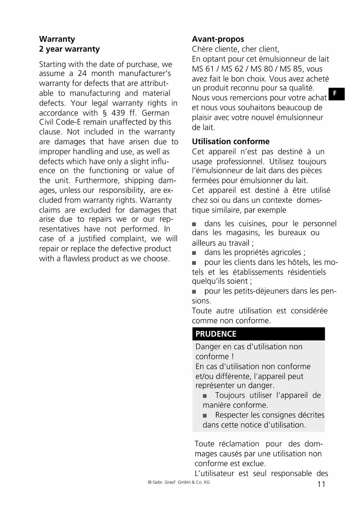 Warranty 2 year warranty Starting with the date of purchase, we assume a 24 month manufacturer’s warranty for defects that are attribut- able to manufacturing and material defects. Your legal warranty rights in accordance with § 439 ff. German Civil Code-E remain unaffected by this clause. Not included in the warranty are damages that have arisen due to improper handling and use, as well as defects which have only a slight inu- ence on the functioning or value of the unit. Furthermore, shipping dam- ages, unless our responsibility, are ex- cluded from warranty rights. Warranty claims are excluded for damages that arise due to repairs we or our rep- resentatives have not performed. In case of a justied complaint, we will repair or replace the defective product with a awless product as we choose. Avant-propos Chère cliente, cher client, En optant pour cet émulsionneur de lait MS 61 / MS 62 / MS 80 / MS 85, vous avez fait le bon choix. Vous avez acheté un produit reconnu pour sa qualité. Nous vous remercions pour votre achat et nous vous souhaitons beaucoup de plaisir avec votre nouvel émulsionneur de lait. Utilisation conforme Cet appareil n’est pas destiné à un usage professionnel. Utilisez toujours l’émulsionneur de lait dans des pièces fermées pour émulsionner du lait. Cet appareil est destiné à être utilisé chez soi ou dans un contexte domes- tique similaire, par exemple ■ dans les cuisines, pour le personnel dans les magasins, les bureaux ou ailleurs au travail; ■ dans les propriétés agricoles ; ■ pour les clients dans les hôtels, les mo- tels et les établissements résidentiels quelqu’ils soient ; ■ pour les petits-déjeuners dans les pen- sions. Toute autre utilisation est considérée comme non conforme. PRUDENCE Danger en cas d'utilisation non conforme ! En cas d'utilisation non conforme et/ou différente, l'appareil peut représenter un danger. ■ Toujours utiliser l'appareil de manière conforme. ■ Respecter les consignes décrites dans cette notice d'utilisation. Toute réclamation pour des dom- mages causés par une utilisation non conforme est exclue. L’utilisateur est seul responsable des12